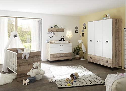 Das Babyzimmer Ronny im Old Style hell-weiß ist ein 6-teiliges Megaset, das alles für ein stilvolles und funktionales Kinderzimmer bietet. Es umfasst einen geräumigen Kleiderschrank, ein Babybett mit Lattenrost und Umbauseiten, eine praktische Wickelkommode sowie ein Wandregal. Die harmonische Farbgestaltung sorgt für eine angenehme Atmosphäre und passt perfekt in jedes Kinderzimmer. **Highlights** - Kleiderschrank mit viel Stauraum und durchdachter Innenaufteilung - Babybett mit drei Schlupfsprossen für einfache Nutzung - Wickelkommode mit Wickelaufsatz und drei Schubkästen - Wandregal mit drei Haken für zusätzlichen Stauraum - Umbauseiten für den flexiblen Umbau zum Juniorbett **Produkteigenschaften** - Kleiderschrank Maße: ca. 142,5 x 201 x 56 cm (BxHxT) - Babybett Liegefläche: 70 x 140 cm (BxL), Aufstellmaße: ca. 76 x 82 x 145 cm (BxHxT) - Lattenrost: 3-fach höhenverstellbar - Wickelkommode Maße: ca. 120 x 96-106 x 56-78 cm (BxHxT) - Wandregal Maße: ca. 96 x 19,5 x 20 cm (BxHxT) - Farbe: Korpus und Fronten in Old Style hell und Weiß **Lieferumfang** - Kleiderschrank - Babybett mit Lattenrost und Umbauseiten - Wickelkommode mit Wickelaufsatz - Wandregal - Matratze nicht enthalten
