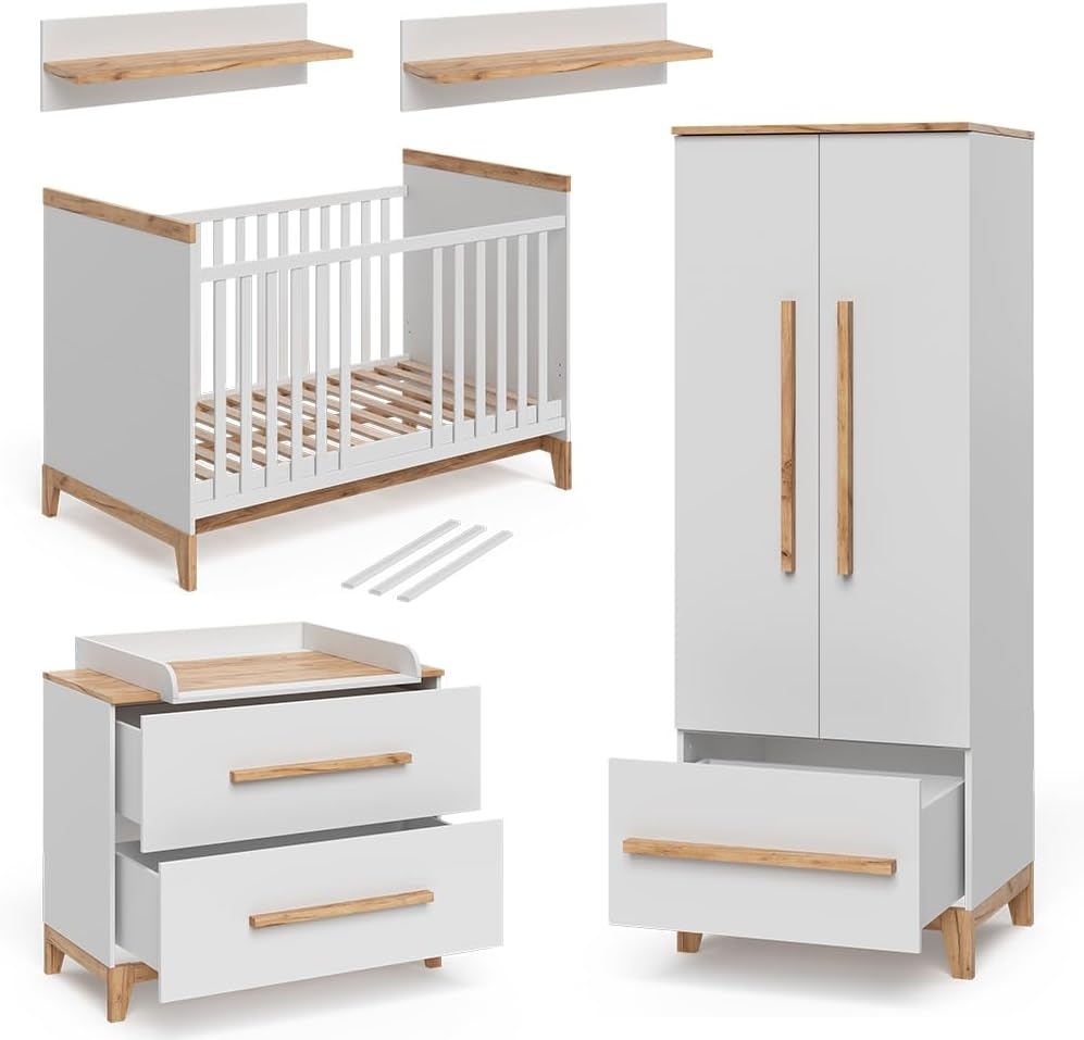| Lieferumfang | 1x Wickelkommode• 2x Wandregale• 1x Kinderbett (ohne Matratze)• 1x Kleiderschrank Dekoration nicht im Lieferumfang |