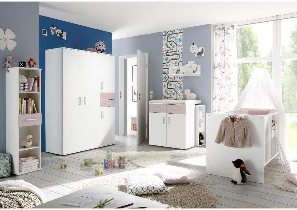 | Lieferumfang | Die Lieferung umfasst einen Kleiderschrank, Wickelkommode, Babybett inkl. Umbauseiten und Lattenrost, Unterstellregal und Wandregal. |