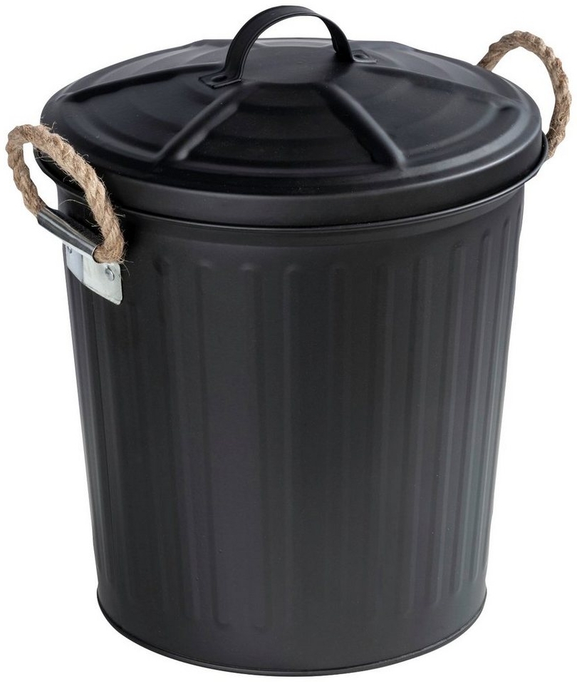 Abfalleimer in Form einer Retro-Mülltonne, passend zur Einrichtung im Industrial Design Mit zwei geflochtenen Henkeln und abnehmbarem Deckel mit Griff Aus lackiertem Stahl in Schwarz mit mattierter Oberfläche Ideal fürs Bad oder Büro, 6 Liter Fassungsvermögen Maße (B x H x T): 24 x 28,5 x 23 cm