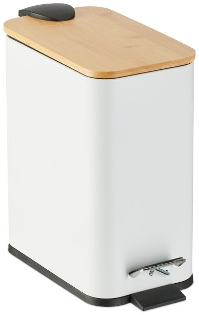Der Bad Mülleimer mit einem Volumen von 5 l bietet eine hygienische und komfortable Lösung zur Abfallentsorgung im Badezimmer oder am Schminktisch. Der rutschfeste Trittpedal ermöglicht ein freihändiges Öffnen, während der entnehmbare Kunststoffeimer mit Henkel das Entleeren erleichtert. Der dekorative Materialmix aus mattem Eisen und natürlichem Bambusdeckel setzt moderne Akzente. **Highlights** - Hygienische Entsorgung von Müll im Bad oder am Schminktisch - Rutschfestes Trittpedal für freihändiges Öffnen des Toiletteneimers - Entnehmbarer Inneneimer mit Henkel erleichtert Entleeren - Mit rückseitigem Griff zum unkomplizierten Tragen des Mülleimers - Mattes Design in Kombination mit Bambusdeckel setzt dekorative Akzente **Produkteigenschaften** - Maße H x B x T: ca. 28,5 x 14,5 x 27 cm - Innenmaße Inneneimer H x B x T: ca. 23,5 x 11,5 x 21 cm - Volumen: ca. 5 l - Gewicht: ca. 1 kg - Material: Eisen, Bambus, Kunststoff **Lieferumfang** - 1x Badmülleimer - Dekoartikel sind nicht im Lieferumfang enthalten