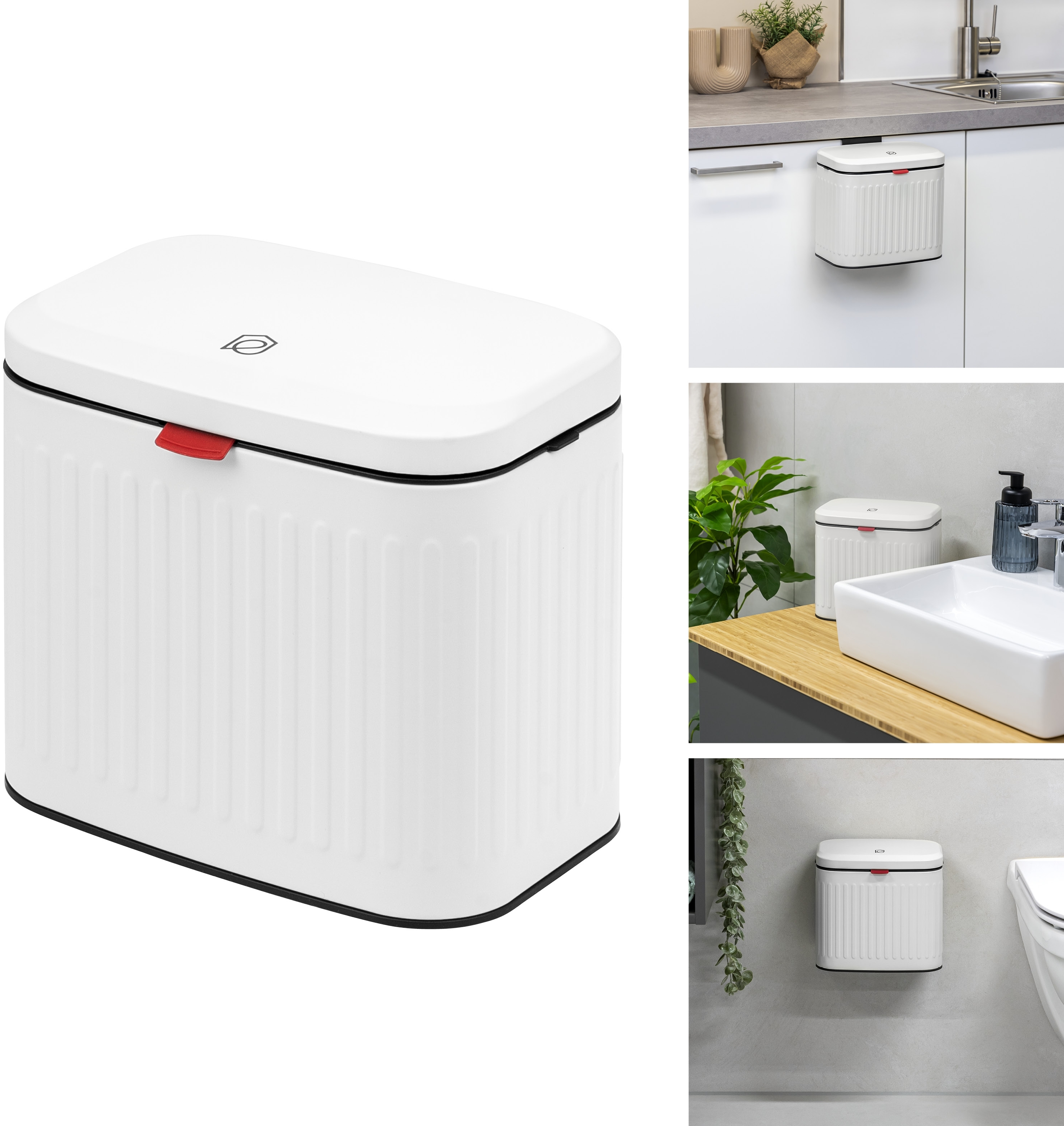 **eluno Abfalleimer 4 Liter inkl. Schranktürhalter und Wandhalterung** Fast zu schön für diesen Zweck! Dieser Müllsammler findet in jeder Küche, oder auch im Bad stets den idealen Verwendungsort. Das schicke Design der gestanzten Streifen ist ein Blickfang in Ihren Räumen! Unser Mülleimer mit einem Fassungsvermögen von 4 Litern aus weißem Metall ist ein absolutes Must-Have für den täglichen Abfall dort wo er anfällt. Sie haben die Wahl zwischen drei flexiblen Verwendungsmöglichkeiten. Egal ob stehend auf der Arbeitsplatte, hängend an der Tür des Küchenschrankes zum direkten Reinschieben von oben, oder an der Wand montiert - dieser Abfalleimer überzeugt durch seine Vielseitigkeit und Funktionalität. Auch ein Hängen an der Innentür vom gängigen Schränken ist möglich. Ein extra Haken für Türen bis 2,3 cm Stärke ist im Lieferumfang des Abfallbehälters inklusive. Dank der innovativen Technik zweier Öffnungsmethoden ist der Deckel immer leicht zu bedienen und stehts stets richtig herum zum Befüllen. Einfach nach oben klappen, oder nach unten wegklappen. Der herausnehmbare Kunststoff-Eimer erleichtert die Reinigung und sorgt für eine hygienische Müllentsorgung. Holen Sie sich jetzt den eluno Abfallsammler und erleben Sie die perfekte Mischung aus Eleganz und praktischem Nutzen als Küchenmülleimer oder Kosmetikeimer. **Die Vorteile auf einen Blick:** * vielseitig einsetzbar * 4 Liter Fassungsvermögen * herausnehmbarer Inneneimer * hygienisch * stellen, einhängen, Wandmontage * zwei Öffnungsmethoden * edles Design * hochwertiges Material * inkl. Schranktürhalter und selbstklebender Wandhalterung * Material: Gehäuse aus weißem Metall, Inneneimer aus Kunststoff * Abmessungen: ca. 22,5 x 20 x 16,5 (B/H/T) **Lieferumfang** 1x Abfalleimer, weiß 1x Schranktürhalter 1x selbstklebender Wandhalterung