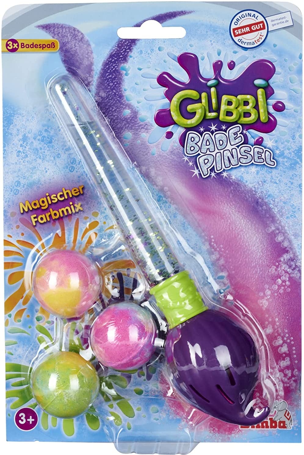 • Glibbi - der ultimative Spaß für die Badewanne. Mit den vielseitigen Glibbi Produkten von Simba Toys kommt garantiert keine Langeweile in der Badewanne auf. Ob sprudelndes buntes Wasser, glibberiger Glibber oder herrlicher Schleim - die Auswahl ist riesig. • Badepinsel - wer möchte nicht gerne in der Badewanne malen? Einfach eine Badebombe in die Pinselspitze legen und los geht der Spaß! Zieht man den Badepinsel nun durch das Wasser, entsteht eine tolle Färbung im Badewasser. Ein tolles Badespielzeug für Kinder. • Mit drei Badebomben - neben dem Glibbi Badepinsel sind in dem Set drei zweifarbige Badebomben enthalten, die das Wasser verschieden bunt färben. Nachfüllbar mit handelsüblichen Badekugeln (max. 4cm Durchmesser) oder Glibbi Blubber. • Dermatologisch getestet - alle Glibbi Produkte sind dermatologisch getestet und absolut unbedenklich. Dies wurde von dem unabhängigen Institut Dermatest bestätigt. Für Kinder ab 3 Jahren geeignet. • Simba - Elefantenstarker Spielspaß. Im Zentrum der Produktentwicklung steht die Begeisterung der Kinder. Für Jungen und Mädchen, Klein und Groß. Kinder sollen Spaß haben und gefördert werden. Achtung! Nicht für Kinder unter 3 Jahren geeignet. Altersempfehlung: 3+ Achtung! Nicht geeignet für Kinder unter 3 Jahren.
