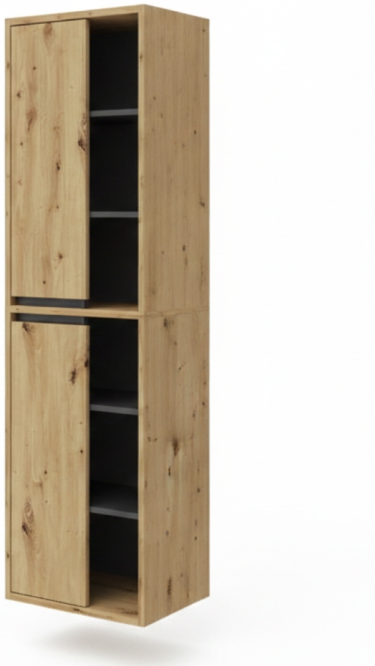 Der Badschrank Viola in Artisan-Eiche ist ein stilvolles und praktisches Möbelstück für Ihr Badezimmer. Mit zwei offenen Fächern und zwei Türen bietet er ausreichend Stauraum für Badutensilien und Wäschestücke. Die Wandmontage ermöglicht eine optimale Raumausnutzung. Der Schrank ist aus pflegeleichter Spanplatte gefertigt und überzeugt durch seine Melaminharzbeschichtung. **Highlights** - Stilvolles Design in Artisan-Eiche / Anthrazit - Zwei offene Fächer für einfachen Zugriff - Zwei Türen mit insgesamt 10 Einlegeböden - Wandmontage für optimale Raumausnutzung - Pflegeleichte Oberfläche durch Melaminharzbeschichtung **Produkteigenschaften** - Maße (BxHxT): 50 x 170 x 33 cm - Material: Spanplatte, 16 mm - Artikelgewicht: 40,02 kg - Artikelgewicht inkl. Verpackung: 42 kg **Lieferumfang** - Badschrank - Montageanleitung - Montagematerial