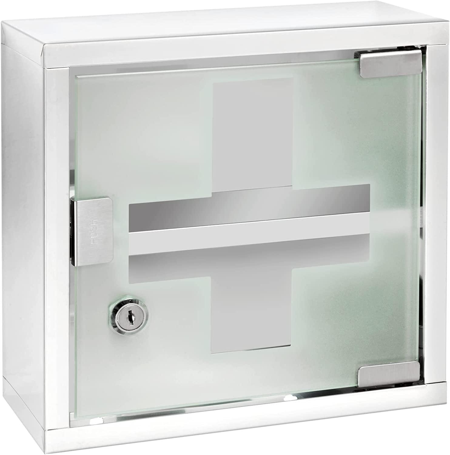 Dekorativer Arzneischrank zur sicheren Aufbewahrung von Medikamenten und Badutensilien Aus hochwertigem, glänzendem Edelstahl und satiniertem Sicherheitsglas mit Dekor Viel Stauraum auf 2 Etagen und abschließbarer Tür zum Schutz vor unbefugtem Zugriff Inklusive Schrauben und Dübel zur Wandbefestigung Maße (B x H x T): 25 x 12 x 25 cm