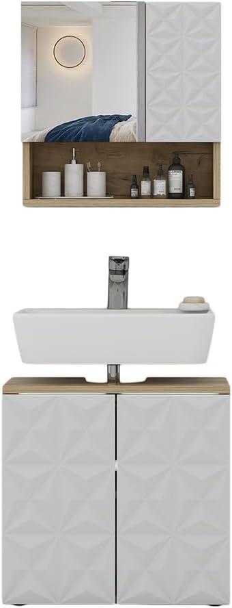 | Lieferumfang | 1x Waschbeckenunterschrank, 1x Spiegelschrank, Montagematerial, Montageanleitung (ohne Dekoration) |