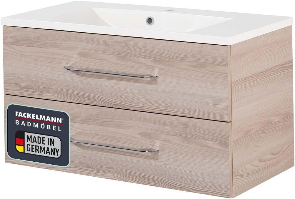 Das Fackelmann B.CLEVER Waschtisch Set aus Gussmarmor vereint modernes Design und Funktionalität für Ihr Badezimmer. Mit einer Breite von 90 cm und einem eleganten Braun hell in Alaska Esche bietet der Waschtischunterschrank zwei geräumige Schubladen mit einem Soft-Close-System. Der Gussmarmor Waschtisch hat eine Stärke von 2,5 cm und ist mit praktischen Hahnloch- sowie Überlauflochbohrungen ausgestattet. **Highlights** - Modernes Design im skandinavischen Stil - Zwei geräumige Schubladen mit Soft-Close-System - Hängende Montage für platzsparende Nutzung - Made in Germany – hohe Qualität und Verarbeitung - Einfache Montage durch verständliche Aufbauanleitung **Produkteigenschaften** - Waschtischunterschrank Maße: 90 cm Breite, 48,5 cm Höhe, 46 cm Tiefe - Gussmarmor Waschtisch Maße: 90 cm Breite, 14 cm Höhe, 46 cm Tiefe - Waschtisch Stärke: 2,5 cm - Material: Gussmarmor, weiß - Ausstattung: Hahnlochbohrung, Überlaufloch - Korpus und Frontfarbe: Braun hell / Design Alaska Esche - Art. Nr. Waschtischunterschrank: 82916 - Art. Nr. Gussmarmor Waschtisch: 83600 **Lieferumfang** - Waschtischunterschrank - Gussmarmor Waschtisch - Aufbauanleitung - Ohne Armatur und Zubehör