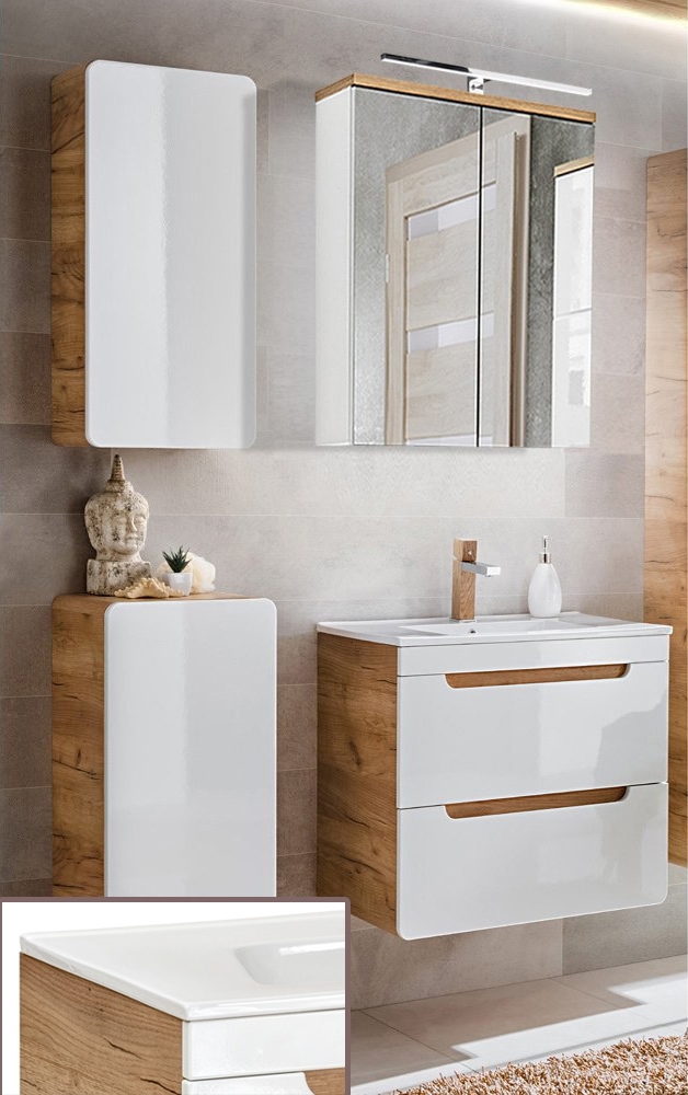 **Materialdaten | Oberflächen | Merkmale** * Front: MDF, Hochglanz weiß, tiefgezogen * Korpus: E1-Qualitätsspanplatte, melaminbeschichtet Wotaneiche Nb. * Wotaneiche: mit 3D-Touchwood-Struktur (fühlbare Oberfläche) * griffloses Design mit Griffmulden in den Fronten * Beschläge und Scharniere: Metall * Schubladen mit Soft-Close-Funktion * Waschbecken: Keramik * Türen (re / li montierbar) mit Türdämpfung (Softclose) * LED Beleuchtung, Lichtfarbe 6000 Kelvin **Lieferumfang | Produktinformation | Maßangaben:** * Badmöbel Set bestehend aus: * 1x Waschtischunterschrank, 2 Softclose-Schubladen, B/H/T ca.: 60/59/46 cm inkl.Waschtisch aus Keramik, mit Hahnloch und Überlauf, B/H/T ca. 61/17/46cm (Innenmaß 41/12/26cm) * 1x Spiegelschrank, 2 Drehtüren, 2 verstellbare Einlegeböden, B/H/T ca.: 60/70/20cm inkl. LED-Aufbauleuchte, verchromt, B/H/T ca. 60/5/10cm * 1x Unterschrank 1 Tür (re/li montierbar), B/H/T ca. 35/68/32 cm * 1x Hängeschrank,1 Tür (re/li montierbar), 1 Einlegeboden, B/H/T ca. 35/75/22 cm * Gesamtmaß B/H/T ca.: 110/200/46 cm (Breite Zwischenabstand berechnet) **allgemeine Qualitätsmerkmale:** * modernes und zeitloses Design * hochwertige MDF-Fronten (Mitteldichte Faserplatte) * Schubkästen & Türen mit komfortablen Softclose-System * widerstandsfähige und unempfindliche Melaminbeschichtung * hochwertige Metallscharniere und -beschläge * strapazierfähige, unempfindliche und lichtechte Oberflächen * hohe Kratz- und Stoßfestigkeit **Montage | Lieferung:** * Lieferung zerlegt zur Selbstmontage * einfache, bebilderte Montageanleitung * schneller Aufbau durch intelligente Konstruktion * Lieferung erfolgt per Paketdienst frei Verwendungsstelle (Aufstellort)