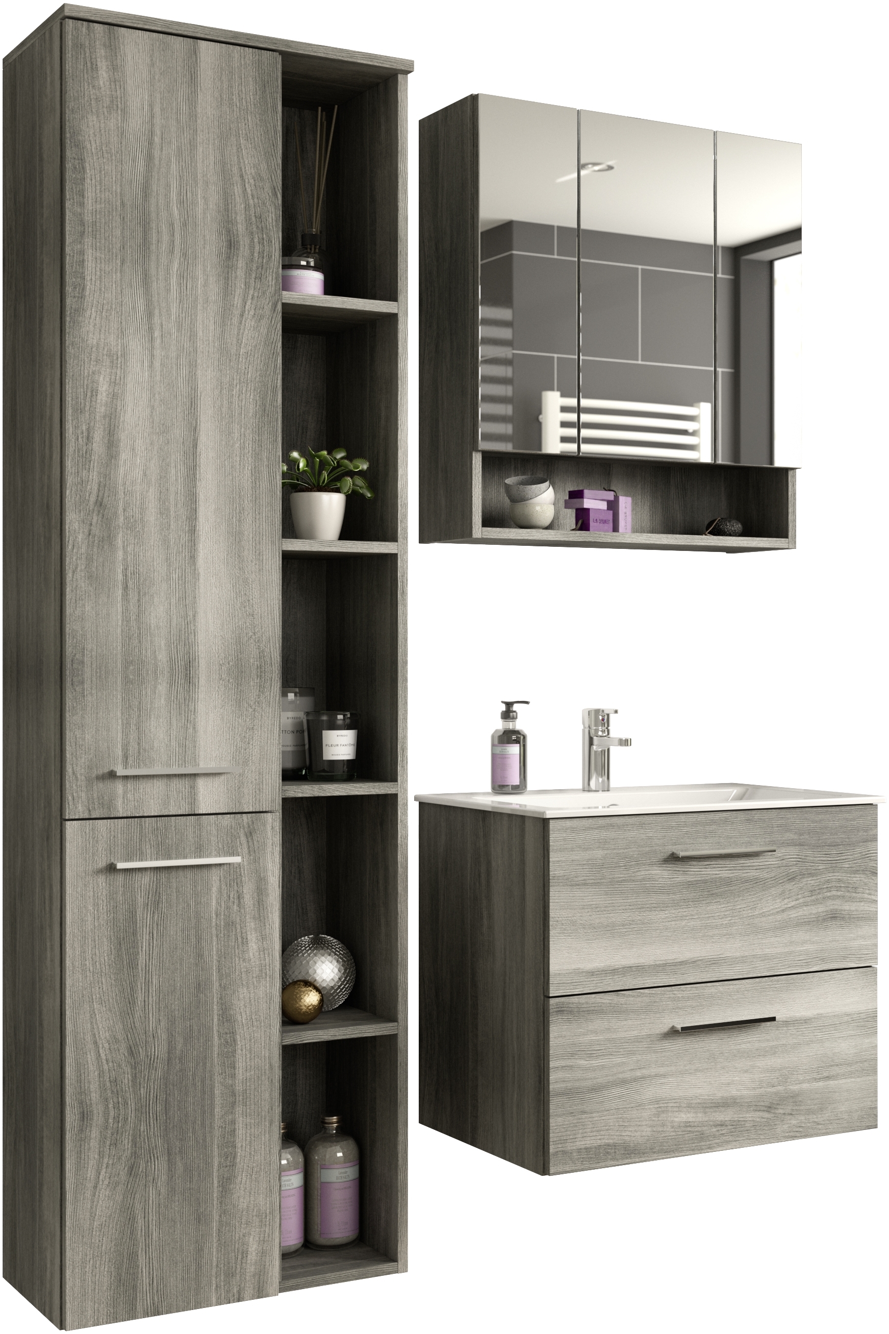 | Lieferumfang | 1x Hängeschrank, 1x Waschbeckenunterschrank, 1x Spiegelschrank |