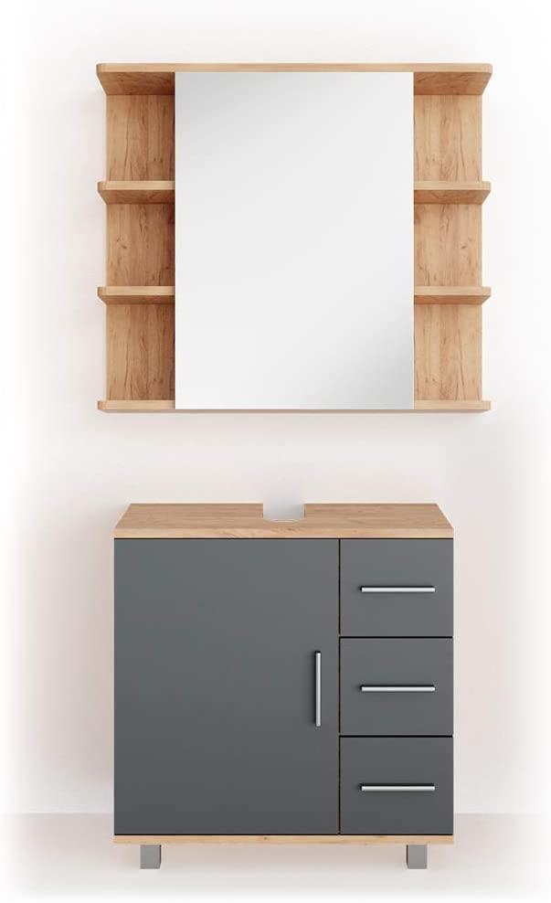 Entdecken Sie das Vicco Badmöbel-Set Ilias, bestehend aus einem Waschbeckenunterschrank und einem Spiegelschrank. Dieses funktionale Set bietet reichlich Stauraum für Ihre Badezimmerutensilien und sorgt für Ordnung. Die Möbel sind aus pflegeleichter Spanplatte (16 mm) gefertigt und verfügen über eine Melaminharzbeschichtung. Mit einem Artikelgewicht von 35,42 kg (37,4 kg inkl. Verpackung) ist das Set stabil und langlebig. **Highlights** - Praktisches Design mit viel Stauraum - Füße für Mobilität und optionale Wandbefestigung - Pflegeleichte Materialien für einfache Reinigung - Melaminharzbeschichtung für zusätzliche Langlebigkeit - Kombinierbar mit anderen Sets der Ilias-Serie **Produkteigenschaften** - Farben: Eiche, Anthrazit - Material: Spanplatte, 16 mm - Oberfläche: Melaminharzbeschichtung - Artikelgewicht: 35,42 kg - Artikelgewicht inkl. Verpackung: 37,4 kg **Lieferumfang** - Bad Spiegelschrank - Waschbeckenunterschrank - Montageanleitung - Montagematerial