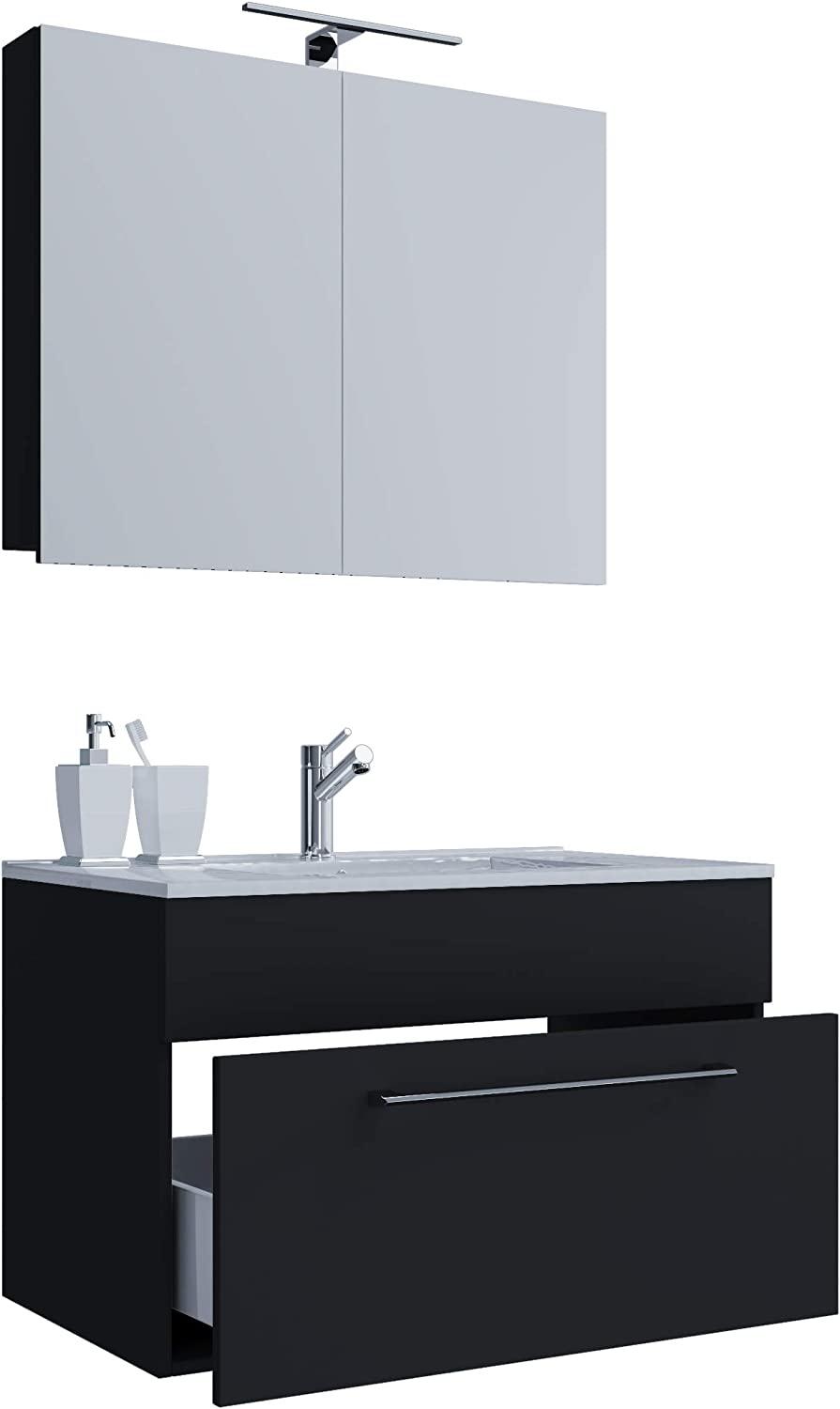 | Lieferumfang | 1x Unterschrank mit Waschbecken (ohne Wasserhahn), 1x Schubfach, 1x Spiegelschrank mit Beleuchtung |