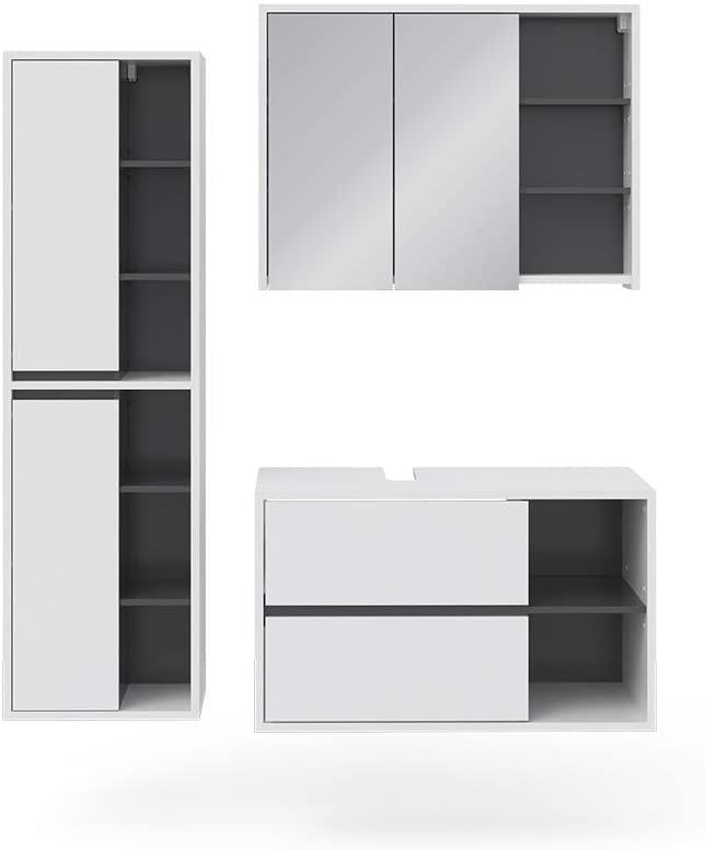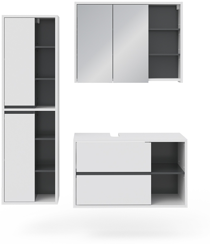 | Lieferumfang | 1x Spiegelschrank, 1x Waschtischunterschrank, 1x Hochschrank |
