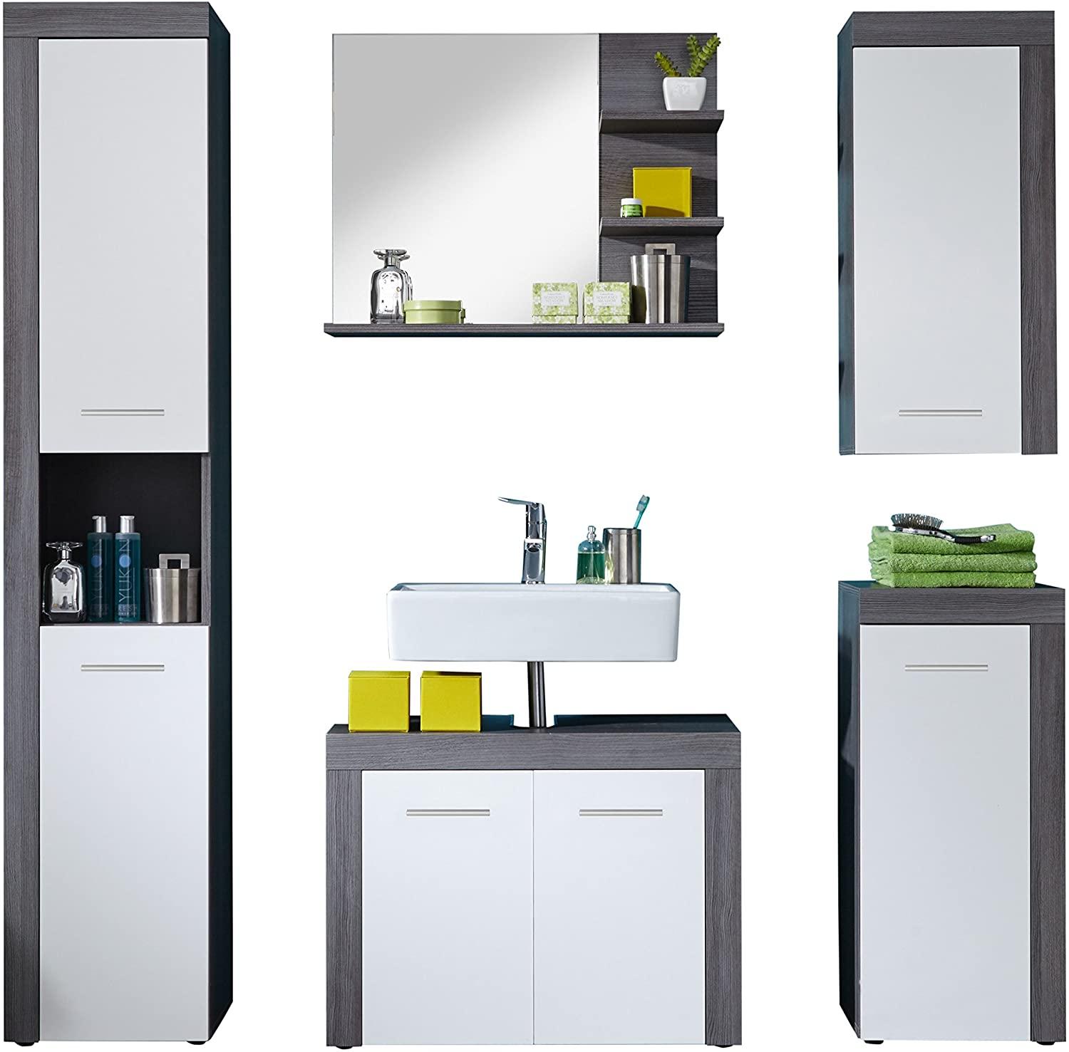 | Name | Bad-Set 5-tlg. 'Miami' mit Hochschrank, Unterschrank, Spiegel, Hängeschrank & Midischrank, Rauchsilber/weiß |