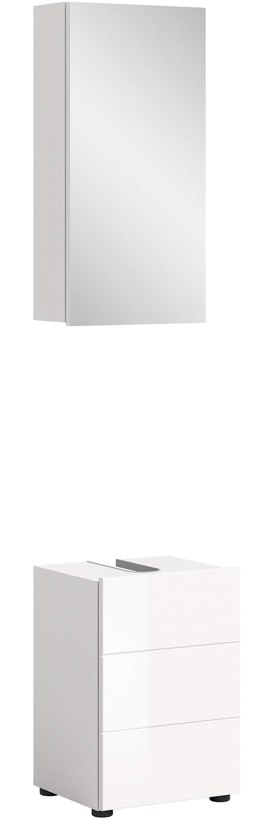 Das Badezimmerset Vira in Weiß und Weiß Hochglanz vereint modernes Design mit praktischen Funktionen. Die Front aus hochglänzendem MDF und der Korpus aus melaminbeschichtetem Holzwerkstoff sorgen für eine ansprechende Optik und Langlebigkeit. Der Waschbeckenunterschrank bietet mit einer Tür und einem Einlegeboden ausreichend Stauraum, während der Spiegelschrank mit zwei Einlegeböden zusätzlichen Platz für Ihre Badutensilien schafft. **Highlights** - Front aus Weiß Hochglanz für eine elegante Optik - Waschbeckenunterschrank mit Tür und Einlegeboden für optimalen Stauraum - Spiegelschrank mit Spiegelglas und zwei Einlegeböden - Türanschlag wechselbar für flexible Montage - Empfohlenes Stellmaß für eine platzsparende Anordnung **Produkteigenschaften** - Front: Weiß Hochglanz, MDF tiefgezogen - Korpus: Weiß Dekor, Holzwerkstoff, melaminbeschichtet - Kunststofffüße, Schwarz - abnehmbar - Waschbeckenunterschrank: Breite: 38cm, Höhe: 56cm, Tiefe: 34cm - Spiegelschrank: Breite: 38cm, Höhe: 77cm, Tiefe: 18cm - Empfohlenes Stellmaß komplett: Breite: 38cm, Höhe: 190cm, Tiefe: 34cm - Syphonausschnitt: 210x90 mm - Bitte beachten: Artikel wird zerlegt geliefert, Aufbauanleitung inklusive **Lieferumfang** - 1x Badezimmerset Vira - Weiß / Weiß Hochglanz - Optionale Badaufsatzbeleuchtung nicht im Lieferumfang enthalten - Dekorationsartikel, Beleuchtungen, Hi Fi-Geräte oder ähnliches nicht im Lieferumfang enthalten