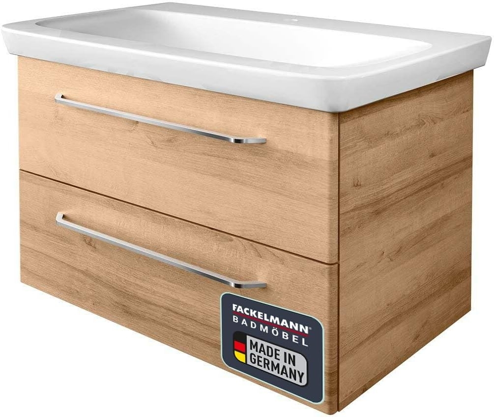Hol Dir mediterranes Flair ins Badezimmer mit dem 2-teiligen Badmöbel-Set MILANO von Fackelmann. Der hellbraune Waschbeckenunterschrank mit einer Breite von 80 cm bietet viel Stauraum durch zwei Schubladen mit Soft-Close-System. Der stilvolle Design-Waschtisch aus weißer Keramik hat eine tiefe Waschmulde, die für ein angenehmes Wascherlebnis sorgt. Hergestellt in Deutschland, überzeugt das Set durch hohe Qualität und eine verständliche Aufbauanleitung. **Highlights** - Mediterranes Flair für Ihr Badezimmer - Großer Stauraum mit zwei Schubladen - Soft-Close-System für sanftes Schließen - Hochwertige Chromgriffe - Design-Waschtisch aus weißer Keramik **Produkteigenschaften** - Maße Waschtischunterschrank: 80 cm Breite, 49,2 cm Höhe, 47,6 cm Tiefe - Maße Keramik-Waschtisch: 88,3 cm Breite, 16,8 cm Höhe, 54 cm Tiefe - Material Waschtischunterschrank: Holz, Braun hell / Design Ast-Eiche - Material Keramik-Waschtisch: Keramik, weiß - Montageart: hängend, zerlegt - Made in Germany **Lieferumfang** - 1x Waschtischunterschrank (Art. Nr. 84202) - 1x Keramik-Waschtisch (Art. Nr. 84200)