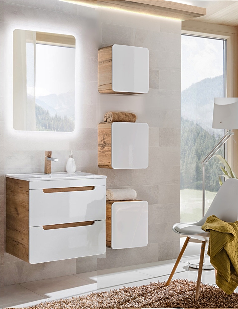 | Name | Badmöbelset Hochglanz weiß mit Wotan Eiche Nb. LUTON-56 mit 61 cm KeramikWaschtisch & LED-Spiegel, B/H/T ca. 110/200/46 cm |