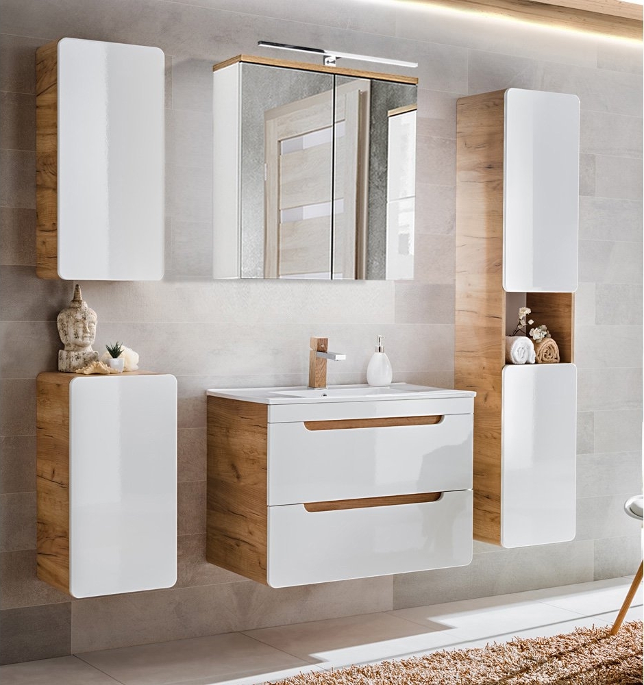 **Materialdaten | Oberflächen | Merkmale** * Front: MDF, Hochglanz weiß, tiefgezogen * Korpus: E1-Qualitätsspanplatte, melaminbeschichtet Wotaneiche Nb. * Wotaneiche: mit 3D-Touchwood-Struktur (fühlbare Oberfläche) * griffloses Design mit Griffmulden in den Fronten * Beschläge und Scharniere: Metall * Schubladen mit Soft-Close-Funktion * Waschbecken: Keramik * Türen (re / li montierbar) mit Türdämpfung (Softclose) * LED Beleuchtung, Lichtfarbe 6000 Kelvin **Lieferumfang | Produktinformation | Maßangaben:** * Badmöbel Set bestehend aus: * 1x Waschtischunterschrank, 2 Softclose-Schubladen, B/H/T ca. 80/59/46 cm * inkl. Waschtisch aus Keramik, mit 1 Hahnloch und Überlauf, Breite 81 cm, Innenmaß Becken: B/H/T ca. 46/14/27cm * 1x Spiegelschrank, 2 Spiegeltüren, LED-Bekleuchtung mit Schalter, 1 verstellbarer Einlegeboden, 2 Glasböden, 3 kleine Fachböden, B/H/T ca. 80/70/20 cm * 1x Hochschrank, 2 Türen, 2 Einlegeböden, 1 Regalfach, B/H/T ca. 35/170/32 cm * 1x Unterschrank 1 Tür (re/li montierbar), 1 Softclose-Schubkasten, B/H/T ca. 35/68/32 cm * 1x Hängeschrank,1 Tür (re/li montierbar), 1 Einlegeboden, B/H/T ca. 35/75/22 cm * Gesamtmaß: B/H/T ca. 181/195/46 cm (Breite inkl je. 15 cm Zwischenabstand) **allgemeine Qualitätsmerkmale:** * modernes und zeitloses Design * hochwertige MDF-Fronten (Mitteldichte Faserplatte) * Schubkästen & Türen mit komfortablen Softclose-System * widerstandsfähige und unempfindliche Melaminbeschichtung * hochwertige Metallscharniere und -beschläge * strapazierfähige, unempfindliche und lichtechte Oberflächen * hohe Kratz- und Stoßfestigkeit **Montage | Lieferung:** * Lieferung zerlegt zur Selbstmontage * einfache, bebilderte Montageanleitung * schneller Aufbau durch intelligente Konstruktion * Lieferung erfolgt per Paketdienst frei Verwendungsstelle (Aufstellort) Hinweis: Dekoration und Mischbatterie nicht im Lieferumfang enthalten, Farbabweichungen der dargestellten Bilder sind durch die jeweiligen Monitorfarbeinstellungen möglich.
