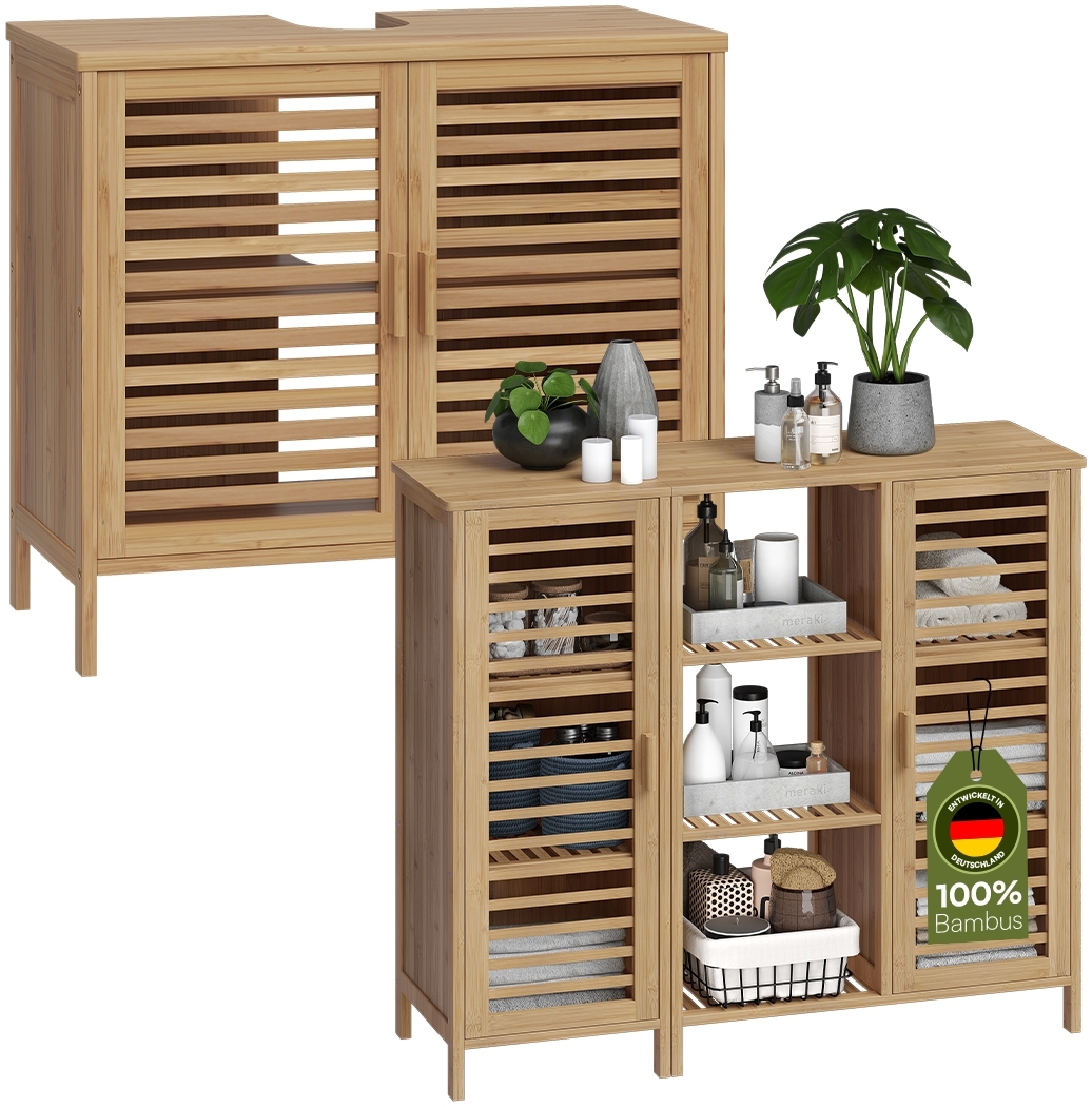 **Harmonisches Design für Ihr Badezimmer** Das Bellamio Badmöbel-Set „Newa“ vereint natürlichen Charme mit funktionaler Ausstattung. Gefertigt aus hochwertigem Bambus, bringen die Möbelstücke Wärme und Eleganz in jedes Bad. Das Set bietet eine abgestimmte Lösung für mehr Ordnung und ein harmonisches Gesamtbild – ideal für alle, die Wert auf Natürlichkeit und ein stimmiges Ambiente legen. **Einheitlicher Look aus Bambus** Beide Möbelstücke sind aus langlebigem Bambus gefertigt und mit einer transparenten Lackierung versehen. Dadurch kommt die natürliche Maserung besonders schön zur Geltung, während die Oberfläche widerstandsfähig bleibt. So entsteht ein zeitloses Design, das sich perfekt in moderne wie klassische Badezimmer integriert. **Viel Stauraum für Badutensilien** Das Set kombiniert einen kompakten Waschbeckenunterschrank mit einem großzügigen Schrank mit insgesamt neun Ablagefächern. Handtücher, Pflegeprodukte und Reinigungsmittel finden hier ebenso Platz wie dekorative Elemente. Geschlossene Fächer sorgen für Ordnung, offene Fächer für eine dekorative Präsentation – die perfekte Mischung aus Funktionalität und Ästhetik. **Flexible Nutzung im Alltag** Der Schrank mit neun Fächern besteht aus zwei separaten Elementen, die flexibel nebeneinander oder einzeln aufgestellt werden können. Damit passen sich die Möbelstücke optimal an die räumlichen Gegebenheiten an. Ob in einem großen Bad oder einem kleineren Raum – das Set lässt sich vielseitig nutzen. **Einfache Montage** Dank der durchdachten Konstruktion und des beiliegenden Montagematerials gelingt der Aufbau beider Möbelstücke schnell und unkompliziert. So können Sie Ihr Badezimmer im Handumdrehen mit mehr Stauraum und einem harmonischen Look ausstatten. **Produktdetails Waschbeckenunterschrank:** - Maße (HxBxT): 60 x 33 x 65 cm - Material: Bambus - Oberfläche: Transparent lackiert - Ausstattung: 2 Ablagefächer - Einfache Montage **Produktdetails Badezimmerschrank:** - Maße gesamt (HxTxB): 87 x 33 x 100 cm - Maße linker Teil (HxTxB): 87 x 33 x 34 cm - Maße rechter Teil (HxTxB): 87 x 33 x 66 cm - Material: Bambus - Oberfläche: Transparent lackiert - Ausstattung: 3 offene Fächer, 6 geschlossene Fächer, 1 große Ablagefläche - Flexible Aufstellung (als Einheit oder separat) - Einfache Montage