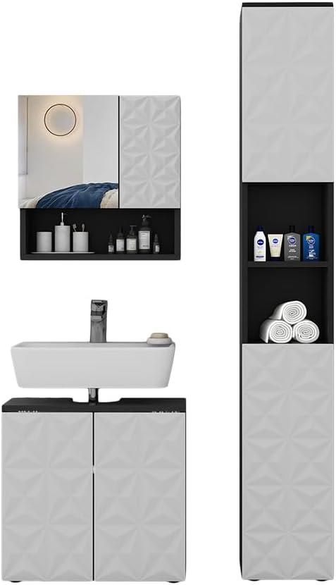Unsere Edge-Badmöbel sind dank der "Push-to-Open"-Funktion selbst mit vollen Händen leicht zu bedienen. Das elegante und moderne Design, lässt Ihr Badezimmer edel wirken und bringt Ihnen Komfort. Dank der höhenverstellbaren Regalfächer, ist zudem alles individuell auf Ihre Bedürfnisse anpassbar. Das moderne Design der Möbel fügt sich nahtlos in jedes Dekor ein. --- **Technische Details:** **Farben:** Schwarz, Weiß **Material:** Spanplatte, 16 mm **Oberfläche:** Melaminharzbeschichtung **Artikelgewicht:** 44.53 kg. **Artikelgewicht inkl. Verpackung:** 47.5 kg. --- LIEFERUMFANG: Badezimmerspiegel, Badschrank, Waschbeckenunterschrank, Montageanleitung, Montagematerial