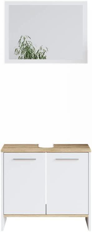 Das Badmöbel Set Elvio ist ein wahrer Hingucker für jeden, der auf skandinavisches Design steht. Das Set besteht aus einem Waschbeckenunterschrank und einem Spiegelschrank, die sich perfekt ergänzen. Die eleganten Griffe runden das Design des Sets ab und sorgen für eine stilvolle Optik. Neben der Ästhetik überzeugt das Set auch mit reichlich Stauraum. Hier findet alles seinen Platz, was man im Badezimmer benötigt. Das Beste daran: Sie können verschiedene Sets der Serie miteinander kombinieren und so genau die Badmöbel zusammenstellen, die zu Ihren Wünschen und Bedürfnissen passen. Und das Beste kommt noch: Das Set kann durch weitere Artikel aus der Elvio Collection ergänzt werden. Überzeugen Sie sich selbst von diesem modernen und innovativen Set und machen Sie Ihr Badezimmer zu Ihrem persönlichen Wohlfühlort! --- **Technische Details:** **Farben:** Weiß, Sonoma **Material:** Spanplatte, 16 mm **Oberfläche:** Melaminharzbeschichtung **Artikelgewicht inkl. Verpackung:** 15.7 kg. **Artikelgewicht:** 13.72 kg. --- LIEFERUMFANG: Waschbeckenunterschrank, Badezimmerspiegel, Montageanleitung, Montagematerial .