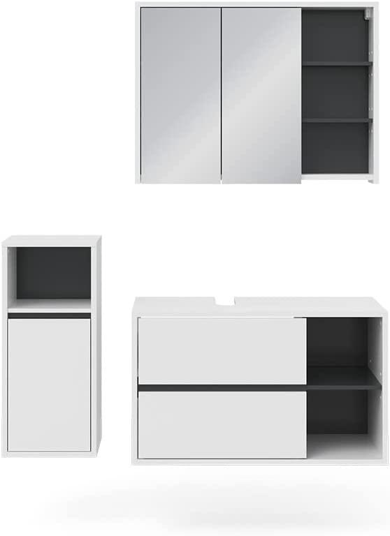 Erleben Sie ein exquisites Badezimmerdesign mit unserem Badmöbel Set Viola! Dieses 3-teilige Set besteht aus einem Waschbeckenunterschrank, einem Spiegelschrank und einem Badezimmerschrank. Mit ihrem eleganten Design und der Möglichkeit, verschiedene Sets der Serie zu kombinieren, verwandeln Sie Ihr Badezimmer in eine Wohlfühloase. Die Schränke können an der Wand angebracht werden und bieten reichlich Stauraum für all Ihre Badutensilien. Und das Beste ist: Sie können dieses Set mit zusätzlichen Gegenständen aus der Viola Collection ergänzen. Verwöhnen Sie sich mit unserem Badmöbel Set Viola! --- **Technische Details:** **Farben:** Weiß, Anthrazit **Material:** Spanplatte, 16 mm **Oberfläche:** Melaminharzbeschichtung. **Artikelgewicht inkl. Verpackung:** 73.6 kg. **Artikelgewicht:** 69.64 kg. --- LIEFERUMFANG: Bad Spiegelschrank, Badschrank, Waschbeckenunterschrank, Montageanleitung, Montagematerial