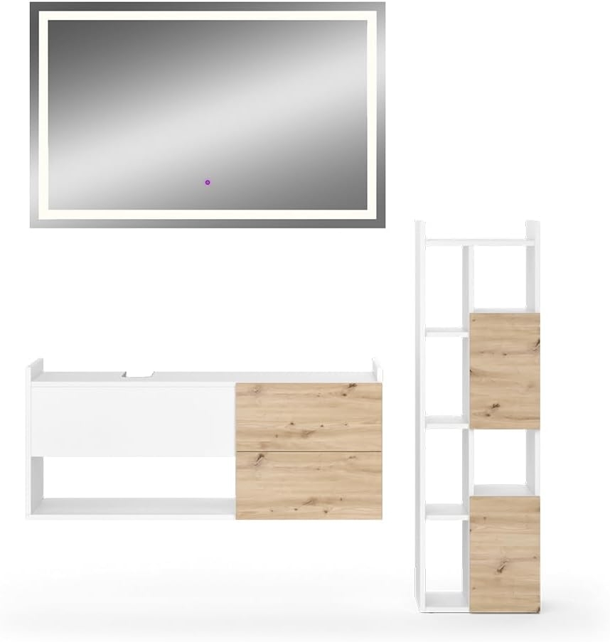 Treten Sie ein in die exklusive Welt der Serie Alf und lassen Sie Ihr Badezimmer in harmonischem Einklang erstrahlen. Tauchen Sie ein in die Annehmlichkeiten der "Push-to-Open" - Funktion, die einen reibungslosen Zugriff auf Ihre Badartikel gewährleistet. Erleben Sie ein zeitgemäßes Design, das sowohl ästhetisch ansprechend als auch funktional durchdacht ist. Genießen Sie die Leichtigkeit der Pflege, da die Oberflächen der Serie mühelos sauber gehalten werden können. Ein Invest in anhaltende Schönheit. --- **Technische Details:** **Farben:** Korpus: Weiß Schubladenfront: Artisan-Eiche LED-Spiegel: Weiß **Maße:** Waschtischunterschrank: 105 x 45 x 43,8 cm (BxHxT) Hochschrank: 36 x 117 x 31,8 cm (BxHxT) LED-Spiegel: 110 x 70 x 2,8 cm (BxHxT) **Material:** Spanplatte, 16 mm **Oberfläche:** Melaminharzbeschichtung **Artikelgewicht:** 51.16 kg **Artikelgewicht inkl. Verpackung:** 54.13 kg --- LIEFERUMFANG: Das Set mit dem Spiegel, Montageanleitung, Montagematerial.