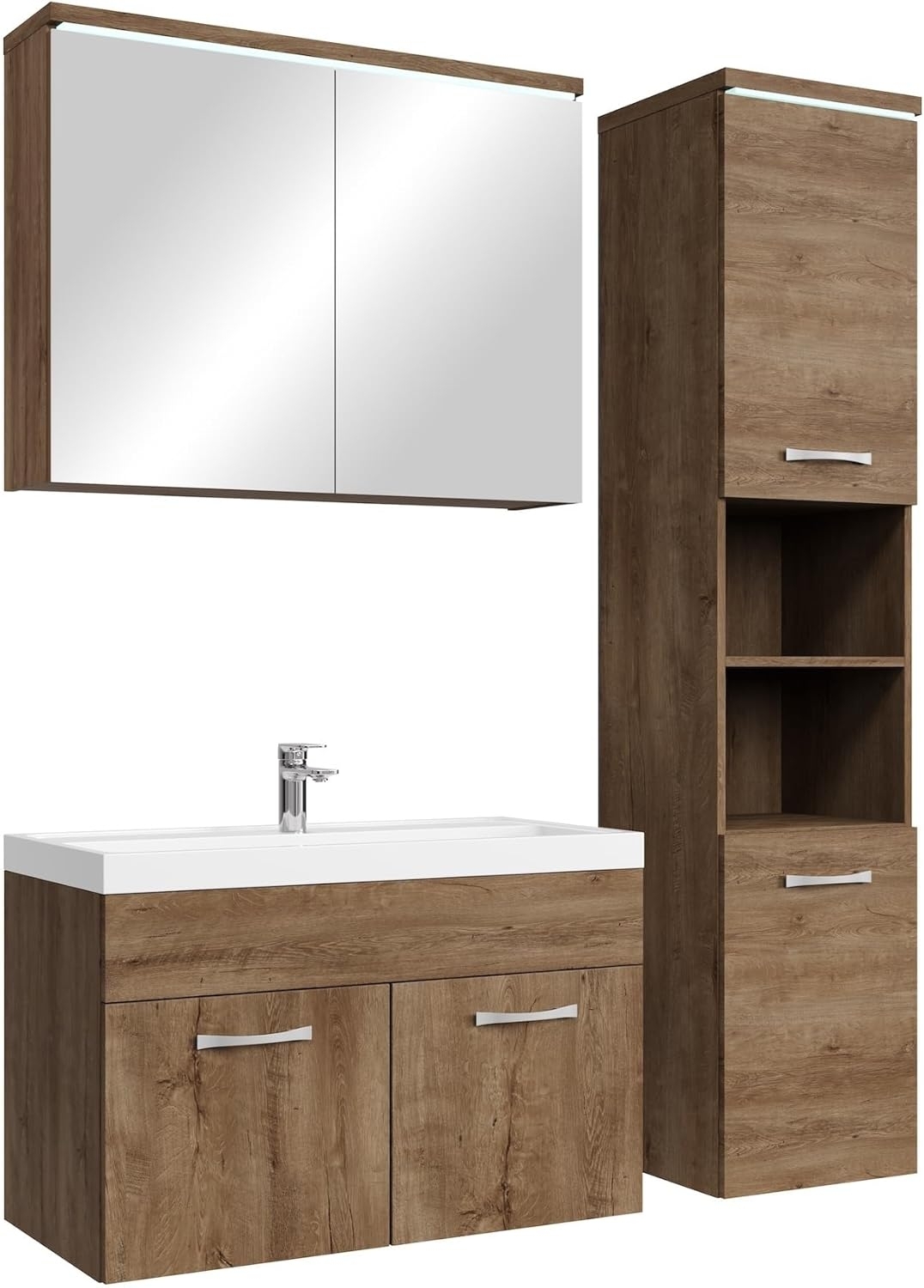 in Badmöbel SetsBadezimmer Badmöbel Set Paso LED 80 cm Waschbecken Lefkas (Braun) - Unterschrank Hochschrank Waschbecken Spiegelschrank