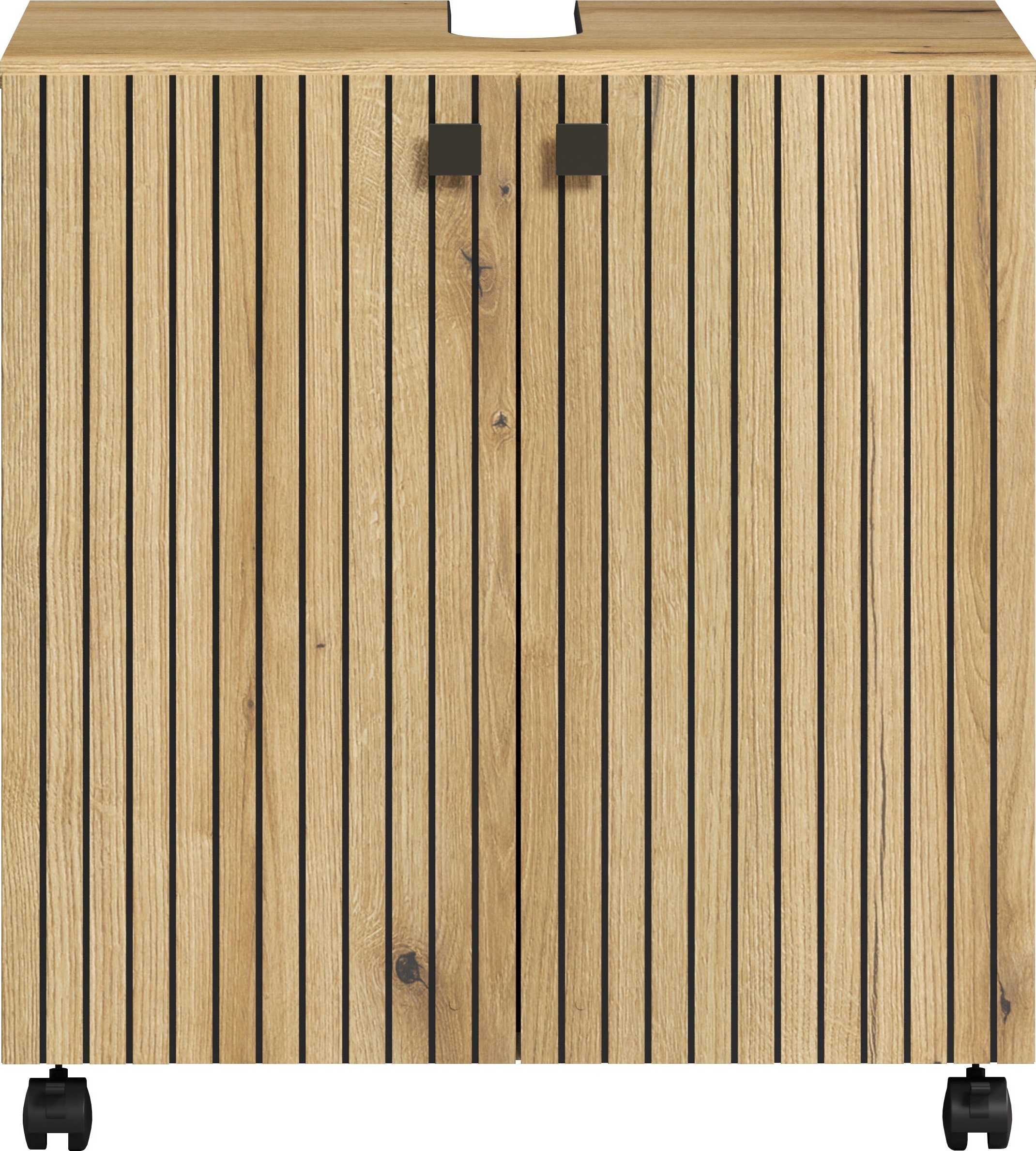 Details: Waschbeckenunterschrank Bliss GE11379-03 Front und Korpus Evoke Eiche Melamin Front in Staboptik mit schwarzen Fugen B/H/T ca.: 60/64/42 cm 2 Türen 1 breiter Einlegeboden / 2 geschlossene Fächer Ausschnitt für Ablauf Einlegeboden höhenverstellbar 4 Rollen Qualität: Trendiger Badschrank mit moderner Staboptik Front und Korpus mit strapazierfähiger Melaminbeschichtung Türfronten in Staboptik mit schwarzen Fugen Metallgriffe in schwarz Metallscharniere variabel einsetzbar durch 4 Rollen FSC®-zertifizierter Holzwerkstoff, aus kontrolliert nachhaltiger Forstwirtschaft Viel Stauraum bei wenig Platzbedarf Pflegeleicht durch glatte Oberflächen, einfach feucht abwischen Das Badmöbelprogramm Bliss bietet eine Vielzahl von Einzelmöbeln mit verschiedenen Stell- und Kombinationsmöglichkeiten Lieferumfang: Zerlegt/Selbstmontage, inkl. bebilderte Aufbauanleitung Montage- und Befestigungsmaterial Dekoration, Waschbecken, Elektrogeräte und Armaturen sind nicht enthalten