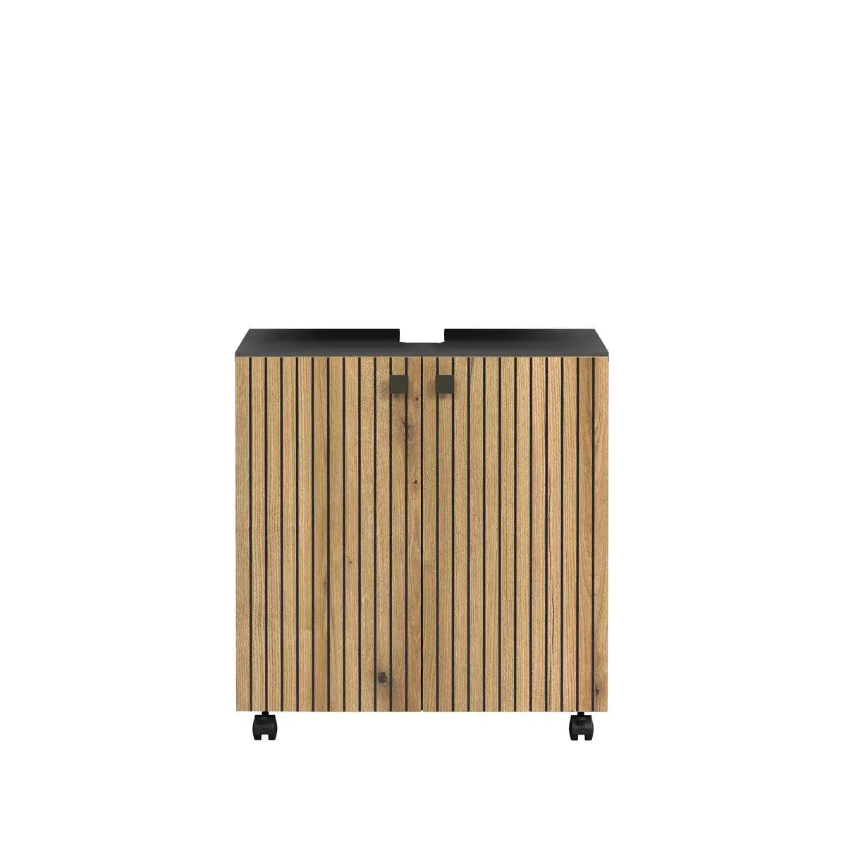 Der trendteam smart living PureBliss Waschbeckenunterschrank auf Rollen in Anthrazit/Eiche vereint modernes Design mit praktischer Funktionalität. Mit den kompakten Maßen von 60 x 64 x 42 cm bietet er ausreichend Stauraum für Handtücher und Reinigungsprodukte. Der Unterschrank verfügt über 2 Türen, 1 Einlegeboden und 2 geschlossene Fächer. Hergestellt aus pflegeleichtem Holzwerkstoff, ist er ideal für den Einsatz im Badezimmer und lässt sich dank der verständlichen Anleitung schnell montieren. **Highlights** - Modernes und funktionales Design - Platzsparende Lösung für jedes Badezimmer - Praktische Stauraummöglichkeiten mit 2 Türen und 1 Einlegeboden - Pflegeleicht durch Holzwerkstoff - Einfache und schnelle Montage **Produkteigenschaften** - Maße (BxHxT): 60 x 64 x 42 cm - Farbe: Anthrazit/Eiche - Ausstattung: 2 Türen, 1 Einlegeboden, 2 geschlossene Fächer - Material: Holzwerkstoff - Rollen für einfache Mobilität