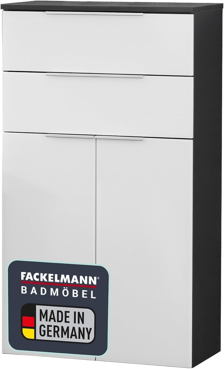 - Der Fackelmann KARA Midischrank hat ein ansprechendes Design in Weiß und Anthrazit, das sich gut in verschiedene Badezimmerstile integrieren lässt.