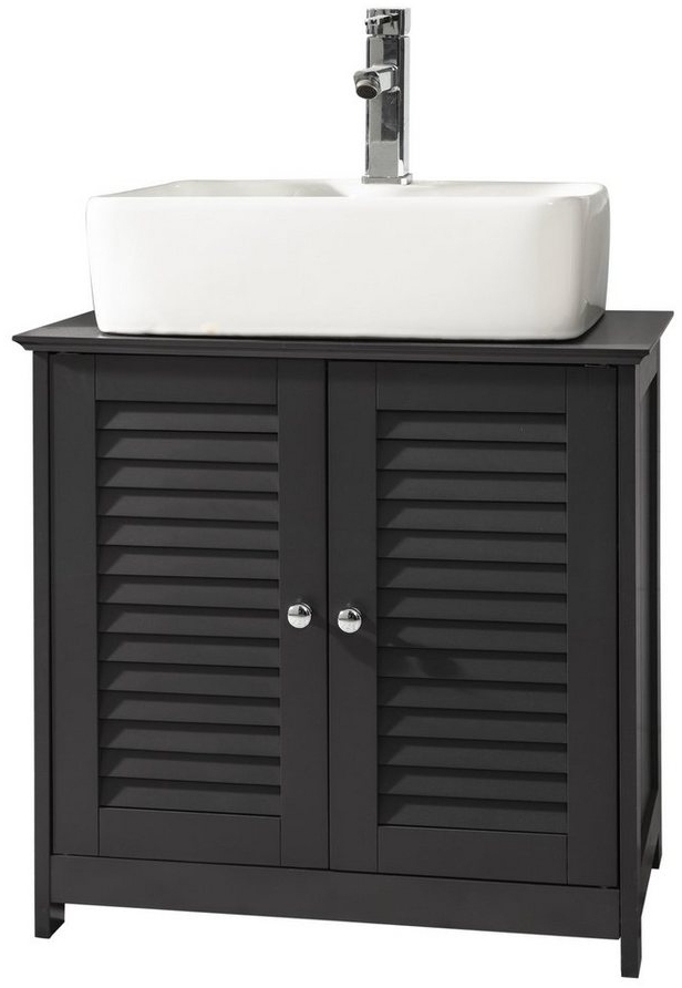 Praktischer Waschbeckenunterschrank aus MDF in dunkelgrau, ideal für zusätzlichen Stauraum im Badezimmer. Mit zwei Türen bietet er ausreichend Platz für Pflegemittel und Utensilien. Die luftdurchlässigen Lamellentüren verhindern Schimmelbildung und sorgen für eine ansprechende Optik. **Highlights** - Zwei Türen für optimalen Stauraum - Lamellentüren zur Schimmelvermeidung - Dekoratives Design - Belastbarkeit bis 30 kg - Leichtes Gewicht von ca. 9,2 kg **Produkteigenschaften** - Material: MDF, dunkelgrau lackiert - Produktmaße: BHT ca. 60 x 58 x 35 cm - Paketmaße: 68 x 41 x 16 cm **Lieferumfang** - 1 x Waschbeckenunterschrank - 1 x Anleitung - 1 x Zubehörbeutel