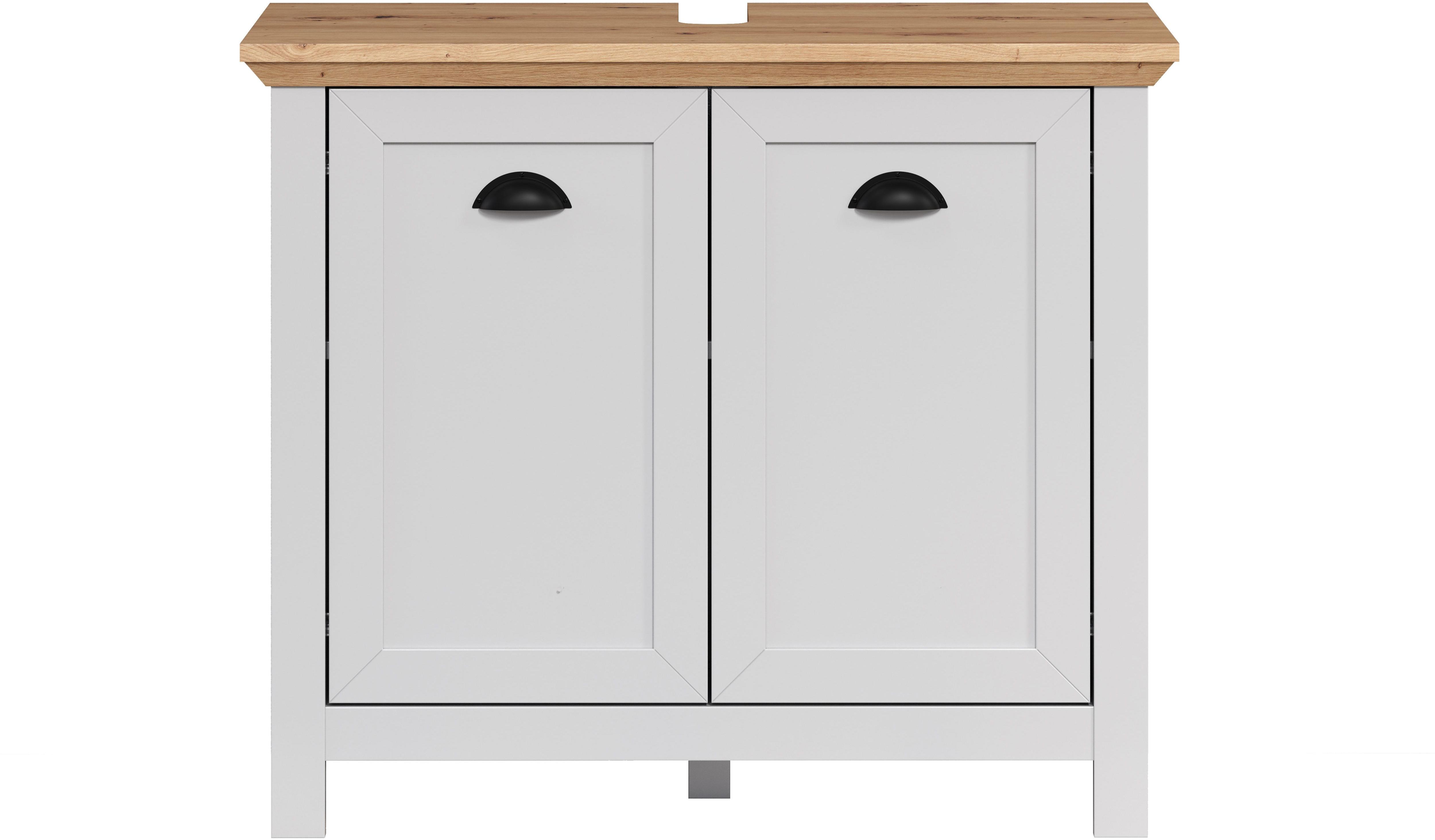 Details: Waschbeckenunterschrank Landside GE11354-02 Front und Korpus Lichtgrau Melamin Absetzung Artisan Eiche Dekor B/H/T ca. : 78/66/39 cm 2 Türen 1 breiter Einlegeboden / 2 geschlossene Fächer Einlegeboden höhenverstellbar Ausschnitt für Abflussrohr mittig Qualität: Moderner Waschbeckenunterschrank in Landhaus Design Front und Korpus in Lichtgrau, strapazierfähige Melaminbeschichtung Absetzung in Artisan Eiche Dekor Muschelgriffe in Metall, schwarz Metallscharniere min. 70% FSC®-zertifizierter Holzwerkstoff, aus kontrolliert nachhaltiger Forstwirtschaft Viel Stauraum bei wenig Platzbedarf Strapazierfähige und pflegeleichte Oberflächen, einfach feucht abwischen Das Badmöbelprogramm Landside bietet eine Vielzahl von Einzelmöbeln mit verschiedenen Stell- und Kombinationsmöglichkeiten Lieferumfang: Zerlegt/Selbstmontage, inkl. bebilderte Aufbauanleitung Montage- und Befestigungsmaterial Dekoration, Waschbecken, Beimöbel, Elektrogeräte und Armaturen sind nicht enthalten