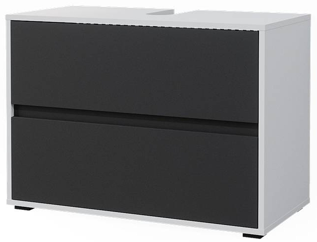 Der Waschbeckenunterschrank Maltin in Weiß-Anthrazit bietet mit seinen zwei großen Schubladen viel Stauraum für Ihre Badaccessoires. Mit einer Breite von 80,2 cm, einer Höhe von 58,2 cm und einer Tiefe von 40,1 cm passt er ideal in jedes Badezimmer. Die Aussparung für den Siphon ermöglicht eine einfache Montage. Der Korpus aus melaminharzbeschichteter Spanplatte sorgt für eine pflegeleichte Oberfläche und Langlebigkeit. **Highlights** - Zwei große Schubladen für optimalen Stauraum - Aussparung für Siphon für einfache Montage - Pflegeleichte melaminharzbeschichtete Oberfläche - Stilvolles Design in Weiß-Anthrazit - Kompatibel mit anderen Produkten der Maltin-Kollektion **Produkteigenschaften** - Maße (BxHxT): 80,2 x 58,2 x 40,1 cm - Material: Korpus aus 16 mm Spanplatte - Artikelgewicht: 25,21 kg - Artikelgewicht inkl. Verpackung: 26,2 kg **Lieferumfang** - Waschbeckenunterschrank - Montageanleitung - Montagematerial