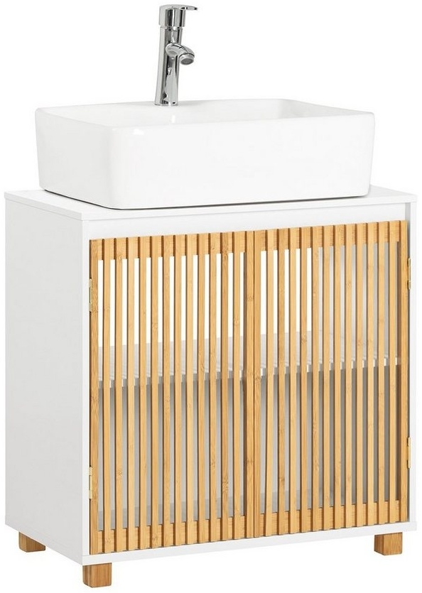 Der SoBuy Waschbeckenunterschrank BZR125 in Weiß-Natur ist die ideale Lösung für Ihr Badezimmer. Mit den Produktmaßen von 60 x 60 x 33 cm bietet er ausreichend Stauraum hinter zwei Türen und einer Trennwand für Toilettenpapier, Reinigungsmittel und mehr. Der Schrank ist aus hochwertigem MDF (E1) und Bambus gefertigt, was ihm Langlebigkeit und ein ansprechendes, natürliches Design verleiht. **Highlights** - Aussparung für den Siphon: Versteckt störende Bauteile unter dem Waschbecken - Zwei Türen: Bieten einfachen Zugang zu Ihren Alltagsgegenständen - Belastbarkeit: Bis zu 27 kg für eine sichere Aufbewahrung - Material: Robustes MDF (E1) und Bambus für Langlebigkeit - Leicht verständliche Montageanleitung: Für eine einfache und schnelle Montage **Produkteigenschaften** - Farbe: Weiß-Natur - Material: MDF (E1), Bambus - Produktmaße (BHT): ca. 60 x 60 x 33 cm - Paketmaße (BHT): ca. 71 x 40 x 15 cm - Gewicht: ca. 9,9 kg **Lieferumfang** - 1 x Waschbeckenunterschrank - 1 x Zubehörbeutel - 1 x Anleitung