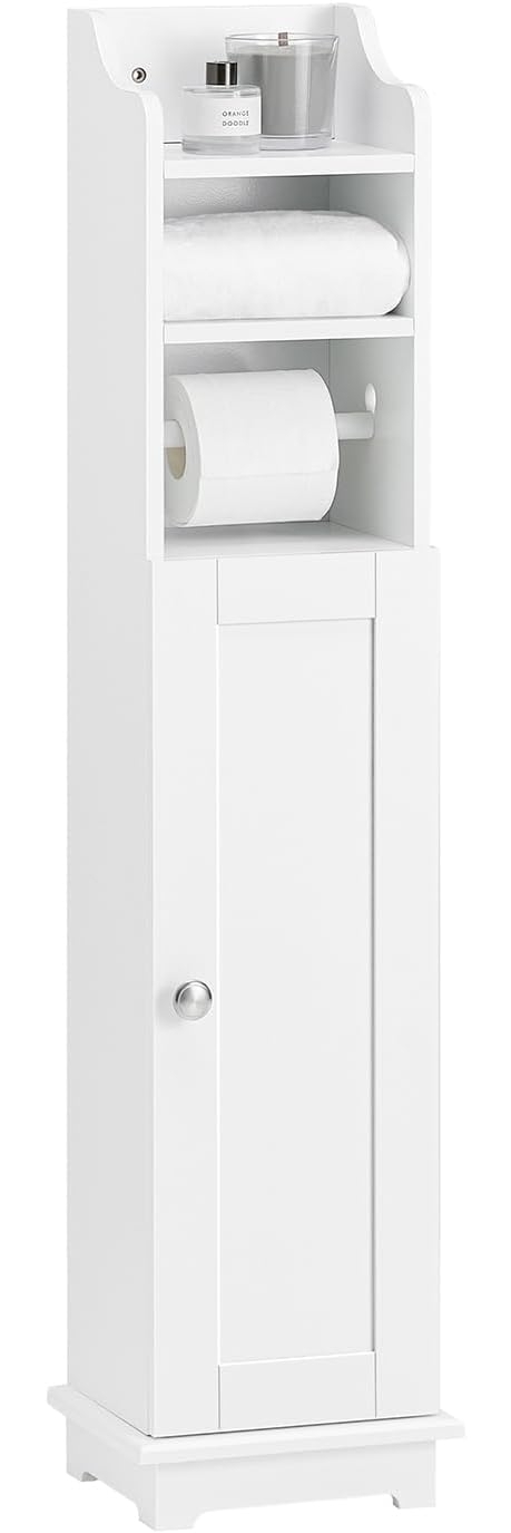 | Beschreibung | Ein praktischer und platzsparender Toilettenrollenhalter und Badregal in Weiß. Der freistehende Schrank aus weiß lackiertem MDF bietet mit 4 verstellbaren Zwischenböden genügend Stauraum für Toilettenpapier, Reinigungsmittel und mehr. Die Abmessungen betragen ca. 23 x 100 x 20 cm (BHT) und das Gewicht ca. 5,9 kg. **Highlights** - 4 verstellbare Zwischenböden für individuelle Nutzung - Platzsparendes Design für mehr Stauraum im Bad - Robustes Material mit einer Belastbarkeit von 4,5 kg - Inklusive einer verstellbaren Ablage mit 0,5 kg Tragkraft - Modernes und ansprechendes Design in Weiß **Produkteigenschaften** - Material: MDF (E1), weiß lackiert - Gewicht: ca. 5,9 kg - Belastbarkeit: 4,5 kg - Produktmaße: ca. 23 x 100 x 20 cm (BHT) - Paketmaße: 103,5 x 27 x 14 cm - Lieferzustand: zerlegt - Verkauf ohne Dekoration |