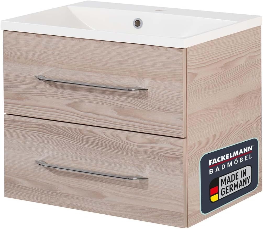 Der Fackelmann B.CLEVER Waschtisch 2-teilig in Braun hell aus Gussmarmor ist die ideale Lösung für moderne Badezimmer. Mit einer Breite von 60 cm eignet sich dieses Set perfekt für kleinere Bäder und Gäste-WCs. Der Waschtischunterschrank in der Farbe Alaska Esche bietet mit zwei Schubladen ausreichend Stauraum. Das sanft geschwungene Waschbecken aus weißem Gussmarmor ergänzt den Unterschrank harmonisch. Die Schubladen schließen dank des Soft-Close-Systems sanft und geräuschlos. **Highlights** - Modernes Design mit sanft geschwungenem Waschbecken - Zwei Schubladen mit Soft-Close-System für geräuschloses Schließen - Breite von 60 cm für kleinere Bäder und Gäste-WCs **Produkteigenschaften** - Waschtischunterschrank: 59,2 cm Breite, 48,3 cm Höhe, 45,7 cm Tiefe - Ausstattung: 2 Auszüge mit Einzugsdämpfung, 2 Griffe, Chrom glänzend - Farbe: Korpus und Front in Braun hell / Design Alaska Esche - Made in Germany - Produktion in Hersbruck bei Nürnberg - Gussmarmor-Doppel-Waschtisch: 60 cm Breite, 14 cm Höhe, 46 cm Tiefe - Material: Gussmarmor, weiß - Ausstattung: Hahnlochbohrung, Überlaufloch - Besonderheit: tiefe Waschmulde **Lieferumfang** - 1x Waschtischunterschrank - 1x Gussmarmor-Doppel-Waschtisch - Montageanleitung