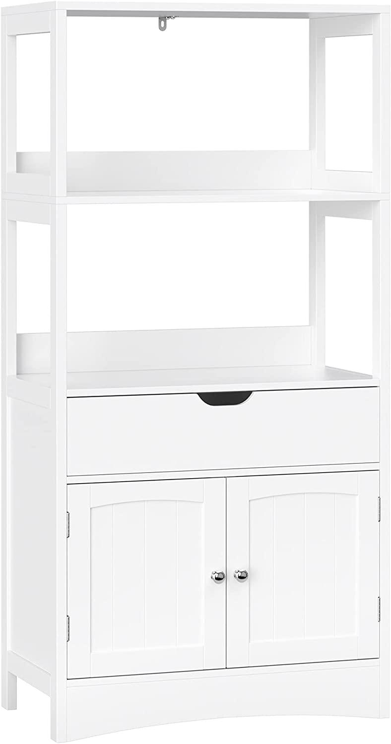 - \*\*Ein Schrank für alle Fälle:\*\*Badezimmer – Streiten Sie immer wieder mit Ihrem Ehepartner darum, wessen Badeutensilien mehr Platz einnehmen? Küche – Suchen Sie noch nach einem Platz für Ihr neues Besteck? Wohnzimmer – Liegt vielerlei Krims-Krams herum? Der VASAGLE Schrank erfüllt all Ihre Wünsche - \*\*Große Kapazität aber kompakte Maße:\*\*2 offene Fächer für häufig benutzte Badeutensilien wie Körperlotion und Rasierer; die Schublade und das Fach hinter den doppelten Türen für trockene Handtücher, Toilettenpapier usw. - **Am wichtigsten –\*\*\*\*Stabilität:** Die robuste Konstruktion aus Faserplatten sorgt für zuverlässige Stabilität und lange Lebensdauer; zudem erhöht der Kippschutz die Sicherheit bei der Benutzung - \**Die Montage –*\*\*\*ein Kinderspiel:\*\*Sie müssen kein DIY-Experte sein; dank der verständlichen sowie bebilderten Anleitung und der gekennzeichneten Teile können Sie das Badregal im Handumdrehen montieren - \*\*Was Sie bekommen:\*\*Einen weißen Badezimmerschrank, der Ästhetik und Funktionalität in sich vereint, und eine Möglichkeit, Ihrem Zuhaue einen Hauch von Frische zu verleihen. Gönnen Sie sich also diesen Schrank und bringen Sie Ihr Badezimmer auf Vordermann - **HINWEIS!** Zur Sicherheit befestigen Sie das Produkt bitte unbedingt mit dem mitgelieferten Kippschutz an der Wand **Vielseitige Aufbewahrungsmöglichkeiten** In den offenen Fächern können Sie die häufig benutzten Badeutensilien griffbereit aufbewahren. In der Schublade finden die trockenen Handtücher den eigenen Platz. Reinigungsmittel, Toilettenpapier usw. verbergen sich hinter der Doppeltür. Auf die oberste Ablage stellen Sie eine Duftkerze, was Ihrem Bad eine romantische Atmosphäre verleiht. **Ein richtiger Allrounder** Nicht nur ins Bad, passt der Schrank auch in die Küche, um den Mikrowellenofen, die Töpfe usw. zu verstauen; im Wohnzimmer können Sie Bücher und Bilderrahmen darin platzieren; im Flur dient er zur Aufbewahrung der Schuhe... Alles liegt bei Ihnen! **Produktdetails:** - Farbe: Weiß - Material: MDF (Mitteldichte Faserplatte) - Größe: 60 x 32,5 x 122 cm (L x B x H) - Gewicht: 16,9 kg **Lieferumfang:** - 1 x Badschrank - 1 x Zubehörpaket - 1 x Anleitung **VASAGLE Hinweise:** - Setzen Sie das Produkt bitte keiner hohen Feuchtigkeit und direkten Sonneneinstrahlung aus. - Halten Sie das Produkt bitte von scharfen oder spitzen Gegenständen fern. - Wenn Sie einen Mikrowellenofen ins Regal stellen möchten, messen Sie vor dem Kauf bitte die Größe Ihres Mikrowellenofens und stellen Sie fest, ob das Regal passt.
