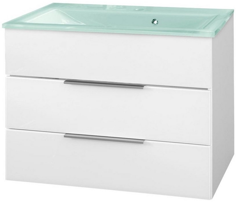 Der Fackelmann 'Kara' Waschtisch ist ein elegantes Badmöbel-Set, das mit einem hochwertigen Glasbecken in Mint und zwei Schubladen in Weiß überzeugt. Mit den kompakten Maßen von 80 x 60 x 50 cm bietet es ausreichend Stauraum für Ihre Badaccessoires. Das Set wird vormontiert geliefert und lässt sich einfach installieren, während das Soft-Close-System für ein sanftes Schließen der Schubladen sorgt. **Highlights** - Zeitloses und elegantes Design - Hochwertiges Glasbecken in Mint - Zwei Schubladen mit weißer Front für ausreichend Stauraum - Soft-Close-System für sanftes Schließen der Schubladen - Made in Germany - Produktion in Hersbruck bei Nürnberg in Franken **Produkteigenschaften** - Maße Waschtischunterschrank: 79,4 cm Breite, 58,7 cm Höhe, 48,8 cm Tiefe - Maße Glas-Waschtisch: 80 cm Breite, 14,3 cm Höhe, 50,1 cm Tiefe - Korpus in mattem Weiß, Front aus lackiertem Glas - Hängende Montageart für ein modernes Erscheinungsbild **Lieferumfang** - 1x Waschtischunterschrank (Art. Nr. 80954) mit 2 Schubladen und Einzugsdämpfung - 1x Glas-Waschtisch (Art. Nr. 86296) in Mint
