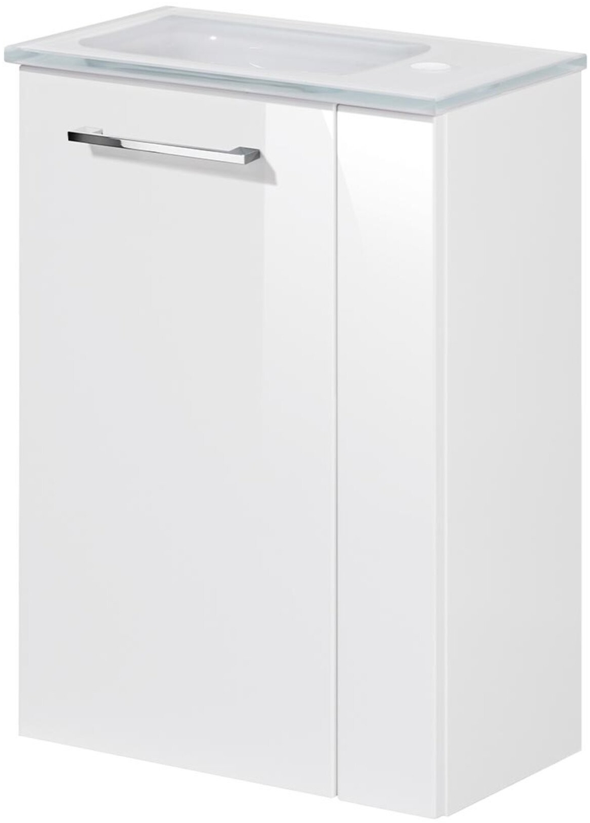 Das Fackelmann SBC SCENO Gäste WC Set 2-teilig 45 cm, Weiß, links, Glas Weiß ist perfekt für kleine Bäder und Gäste-WCs geeignet. Der Waschbeckenunterschrank in klassischem Weiß bietet mit einem Einlegeboden ausreichend Stauraum für kleine Badutensilien. Das Set enthält ein Waschbecken aus Glas, das auf der linken Seite platziert ist. Ein besonderes Highlight ist das optionale Backlight (Art. Nr. 86301), mit dem das Becken indirekt beleuchtet werden kann. Das Set wird vormontiert geliefert und kann einfach in dein Badezimmer integriert werden. **Highlights** - Perfekt für kleine Bäder und Gäste-WCs - Geradliniges und zeitloses Design in klassischem Weiß - Einlegeboden im Inneren des Schranks für Ordnung - Waschbecken aus Glas mit optionalem Backlight (Art. Nr. 86301) - Vormontierte Lieferung für einfache Installation **Produkteigenschaften** - Maße Waschbeckenunterschrank: 44 cm Breite, 60 cm Höhe, 24 cm Tiefe - Ausstattung Waschbeckenunterschrank: 1 Tür (links verwendbar), 1 Einlegeboden, gedämpfte Scharniere, Griff Chrom glänzend - Farbe Waschbeckenunterschrank: Korpus Weiß Glanz, Front Weiß Hochglanz - Maße Waschbecken: 45 cm Breite, 1,5 cm Höhe, 9,7 cm Tiefe - Material Waschbecken: Glas - Farbe Waschbecken: Weiß **Lieferumfang** - 1x Waschbeckenunterschrank SBC SCENO (Art. Nr. 86015) - 1x Waschbecken Gäste Bad (Art. Nr. 82397)
