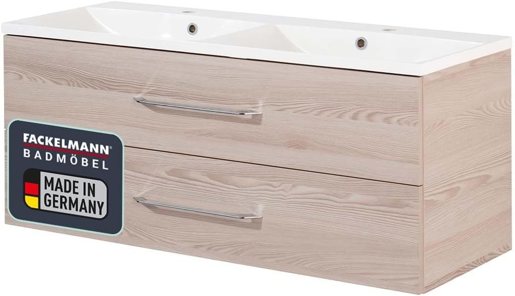 Das Fackelmann B.CLEVER Doppel-Waschtisch Set aus Gussmarmor ist die ideale Lösung für moderne Familienbäder. Mit einer Breite von 120 cm bietet der Waschtisch ausreichend Platz. Der Waschtischunterschrank in Ast-Eiche verfügt über zwei geräumige Schubladen mit einem Soft-Close-System für leises Schließen. Die chromglänzenden Griffe setzen elegante Akzente. Das Set wird zerlegt geliefert und lässt sich einfach montieren. **Highlights** - Doppel-Waschtisch mit 120 cm Breite - Waschtischunterschrank mit zwei geräumigen Schubladen - Soft-Close-System für leises Schließen - Hochwertiges Gussmarmor-Material - Elegantes Design in Ast-Eiche **Produkteigenschaften** - Maße Waschtischunterschrank: 119 cm (B) x 48,3 cm (H) x 45,7 cm (T) - Maße Gussmarmor-Doppel-Waschtisch: 120 cm (B) x 14 cm (H) x 46 cm (T) - Material: Gussmarmor - Farbe: Braun hell (Korpus und Front), Ast-Eiche (Design) - Hahnlochbohrung und Überlaufloch vorhanden **Lieferumfang** - 1x Waschtischunterschrank - 1x Gussmarmor-Doppel-Waschtisch - Montageanleitung