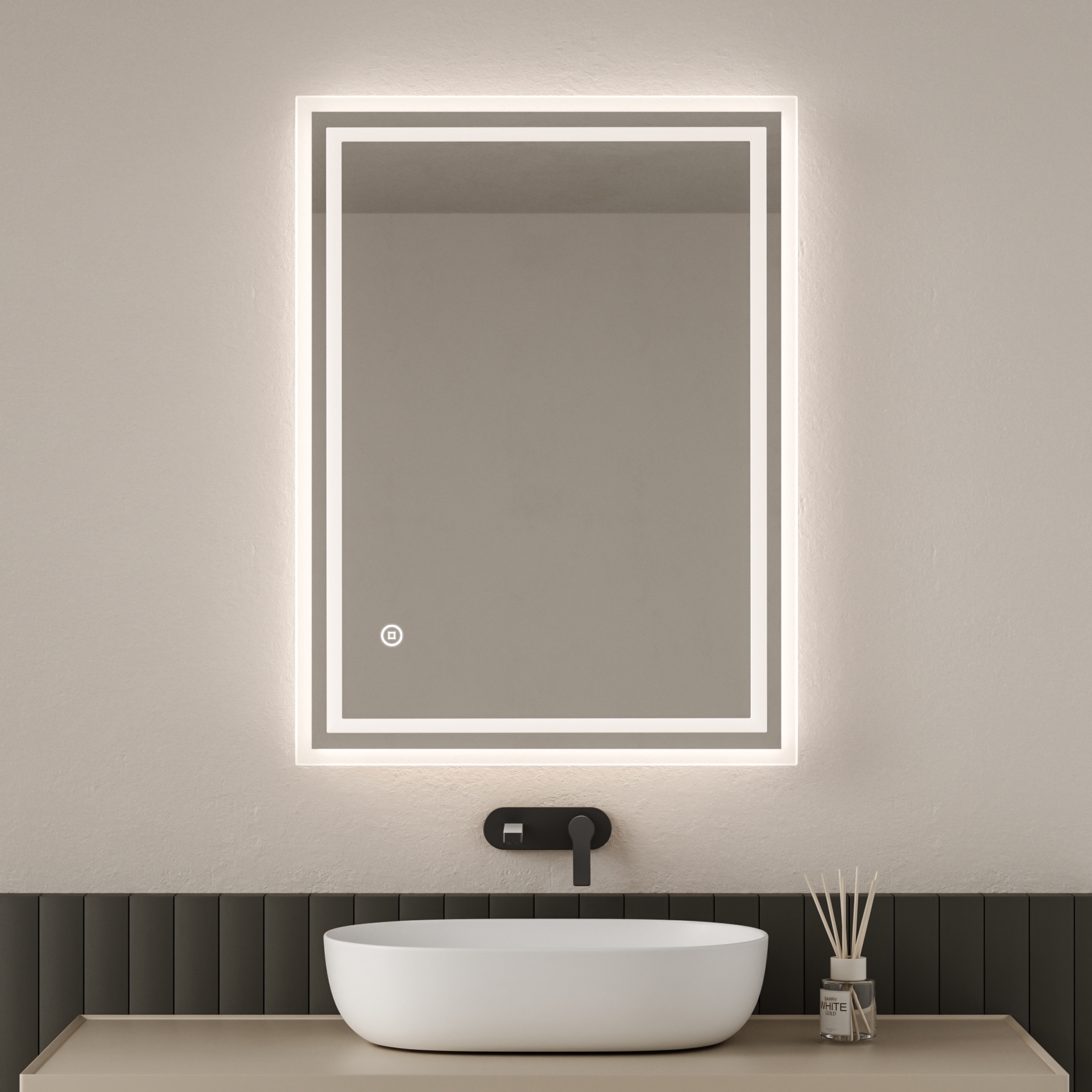 Der EMKE Badspiegel mit Beleuchtung bietet Ihnen eine moderne Lösung für Ihr Badezimmer. Mit den Abmessungen von 80 x 60 cm und kaltweißem Licht sorgt er für eine optimale Ausleuchtung. Der Touchschalter ermöglicht eine einfache Bedienung und zeigt den Betriebszustand durch Farbwechsel an. Der Spiegel ist IP44 wasserdicht und beschlagfrei, was ihn ideal für feuchte Umgebungen macht. **Highlights** - Touchschalter mit Farbwechsel - Hochglanzpolierte Kanten für bessere Reflexion - Wasserdicht und feuchtigkeitsbeständig - Lange LED-Lebensdauer von 50.000 Stunden - Vielseitige Anpassungsmöglichkeiten **Produkteigenschaften** - Farbtemperatur: 6500 K - Helligkeit einstellbar - CRI > 90 für hohe Auflösung - Maße: 80 x 60 cm **Lieferumfang** - LED Badezimmerspiegel - Befestigungsmaterial - Montageanleitung