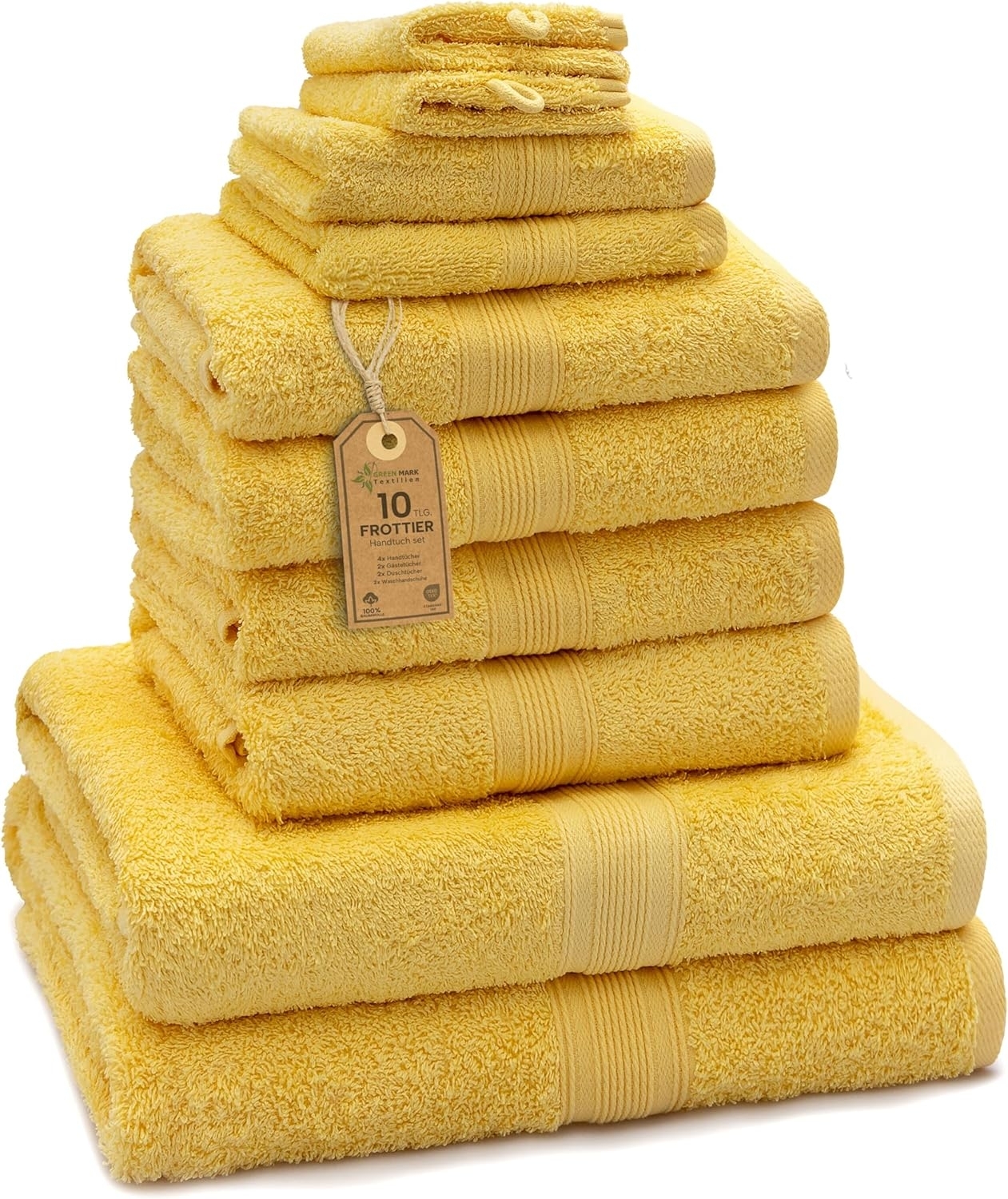 | Name | GREEN MARK Textilien 10 TLG. FROTTIER Handtuch-Set mit verschiedenen Größen 4X Handtücher, 2X Duschtücher, 2X Gästetücher, 2X Waschhandschuhe | Farbe: Gelb | Premium Qualität |