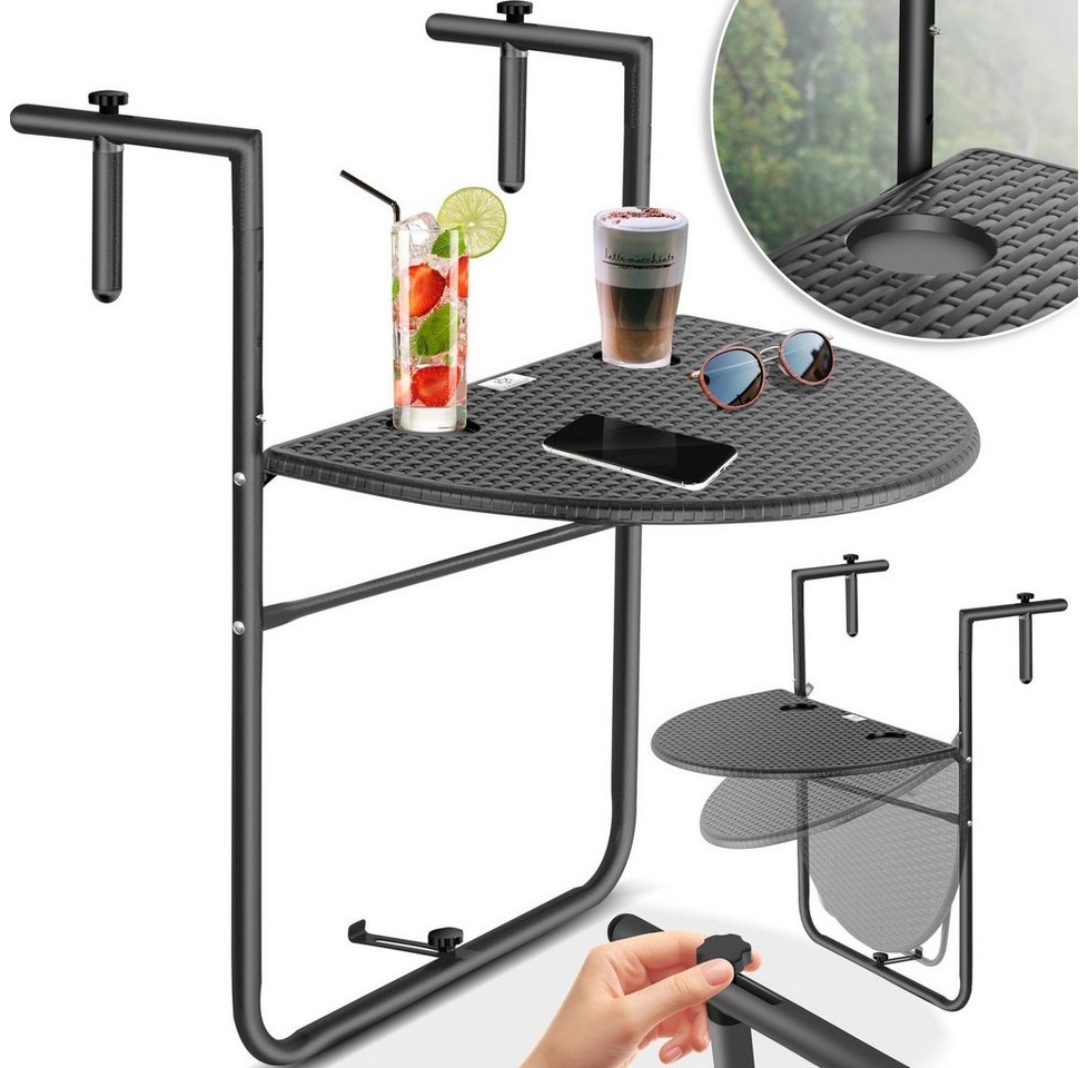 Der klappbare Balkonhängetisch von KESSER ist die perfekte Lösung für kleine Balkone. Mit einer Tragkraft von bis zu 20 kg und einer wetterfesten, stabilen Konstruktion ist er ein Must-have. Die Tischplatte in Rattanoptik ist flexibel einstellbar und bietet mit 3 Höhenstufen genügend Platz für Speisen und Getränke. Zwei integrierte Getränkehalter sorgen für zusätzliche Stabilität. Der Tisch passt auf Balkone mit Geländerstärken von 6,5 cm bis 15,5 cm und lässt sich einfach montieren. **Highlights** - Tragkraft von bis zu 20 kg: Robust und stabil - 3-fach höhenverstellbare Tischplatte: Flexibilität für verschiedene Bedürfnisse - Wetterfestes Material: Langlebig und pflegeleicht - Zwei integrierte Getränkehalter: Praktisch und stabil - Passt auf Geländerstärken von 6,5 cm bis 15,5 cm: Universell einsetzbar **Produkteigenschaften** - Maße Tischplatte: 62x60 cm - Material: Rattanoptik - Höhenverstellbar: Ja, 3-fach - Tragkraft: Bis zu 20 kg - Geeignet für Geländerstärken von 6,5 cm bis 15,5 cm - Einfache Montage mit Anleitung enthalten