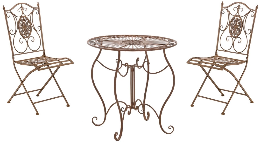 | Beschreibung | Diese nostalgische Sitzgruppe Aldeano ist ein echter Blickfang für Terrassen und Gärten. Mit grazilen Formen und handgefertigten Verzierungen verleiht sie jedem Außenbereich eine besondere Note. Hergestellt aus stabilem Eisen mit antiker Patina ist sie eine perfekte Reproduktion im historischen Stil. Einfacher Aufbau. **Highlights** - Nostalgisches Design - Handgefertigte Verzierungen - Stabile Eisenkonstruktion - Antike Patina-Oberfläche - Leichter Aufbau **Produkteigenschaften** - Material: Eisen - Farbe: Antike Patina - Stuhl Abmessungen: - Gesamthöhe: 91,5 cm - Gesamtbreite: 42 cm - Gesamttiefe: 49 cm - Sitzhöhe: 42 cm - Sitzfläche (BxT): 39x36 cm - Breite Rückenlehne: 39 cm - Tisch Abmessungen: - Gesamthöhe: 72 cm - Gesamtbreite: 70 cm - Gesamttiefe: 70 cm - Durchmesser Rohr: 1,5 cm |