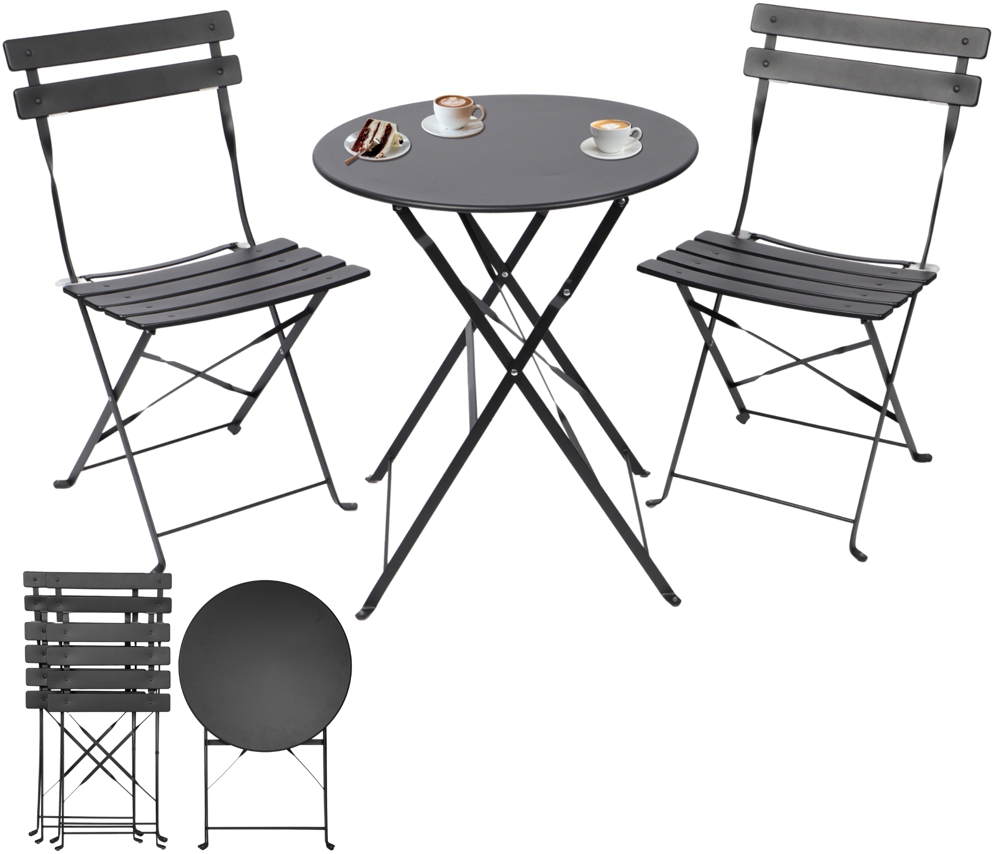 Entdecken Sie das Albatros Bistroset 3-teilig in Schwarz, bestehend aus einem runden Tisch und zwei klappbaren Stühlen aus robustem Metall. Dieses Set vereint modernes Design mit Funktionalität und ist ideal für den Innen- und Außenbereich. Die Möbel sind langlebig, UV- und rostbeständig und bieten hohen Komfort für entspannte Stunden auf Balkon, Terrasse oder im Garten. **Highlights** - Südländisches Flair mit runden Tisch und ergonomischen Stühlen - Praktisch vormontiert und klappbar für einfache Aufbewahrung - Vielseitige Anwendungsmöglichkeiten für private und gewerbliche Nutzung - Leichte Reinigung und hohe Sicherheit dank standfesten Füßen mit Anti-Rutsch-Noppen - Eurofins geprüfte Qualität nach EN581-1, 581-2 und EN581-3 mit Zertifikat Nr. EFHZ23104325-CG-01 **Produkteigenschaften** - Maße Stühle: 82 x 42 x 47 cm (HxBxT) - Tischhöhe: 71 cm, Durchmesser: 60 cm - Tisch bis 80 kg belastbar, Stühle bis jeweils 110 kg - Material: Robustes Metall mit UV- und rostbeständiger Oberfläche - Inklusive abnehmbarem Kantenschutz für den Untergrund **Lieferumfang** - 1x Bistrotisch - 2x Klappbare Stühle - Montage nicht erforderlich