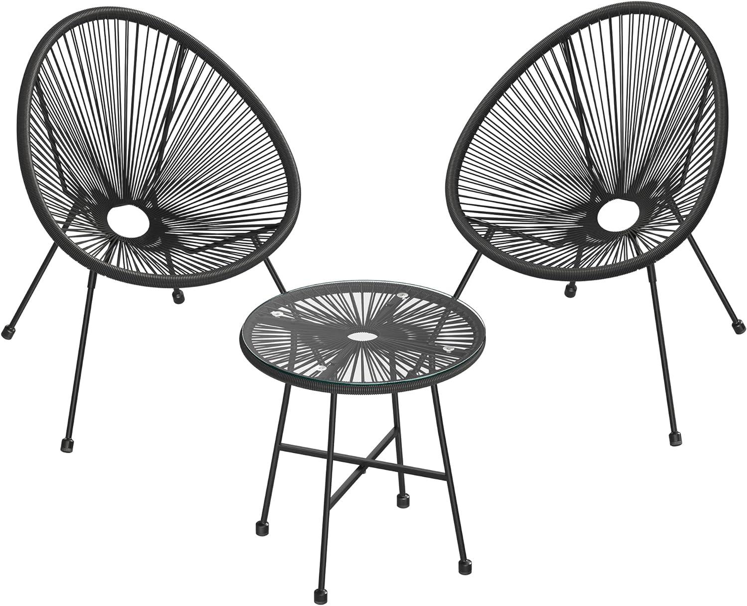 Versinken Sie in Gemütlichkeit: Mit einem ergonomischen Design, der breiten Sitzfläche und dem elastischen PE-Polyrattan bieten Ihnen diese Balkonmöbel festen Halt und hohen Komfort. Lehnen Sie sich zurück und entspannen Sie sich! Gute Stabilität dank. den rostfreien, robusten Stahlbeinen und dem leichten, aber verschleißfesten PE-Polyrattan. Dadurch trägt jeder Stuhl bis zu 130 kg. Der Beistelltisch hält dank seiner Hartglasplatte bis zu 60 kg aus Kinderleichte Montage: Der Zusammenbau dieser Sitzgruppe ist keine große Sache! Schrauben Sie einfach die Beine an die Sitzfläche – es ist kein Werkzeug erforderlich – und die Montage ist in wenigen Minuten erledigt! Schlichte Eleganz: Die Acapulco-Stühle sind die mexikanischen Designikonen der 50er Jahre. Mit dem luftigen Look und den einfachen, geometrischen Linien integrieren sich diese ansprechenden Terrassenmöbel leicht in Ihre Einrichtung Drinnen oder draußen? Sie entscheiden! Sie können diese Terrassenmöbel verwenden, um. sich in einer sonnenbeschienenen Wohnzimmerecke einzukuscheln, ein verträumtes Schlafzimmer einzurichten oder einfach entspannt Cocktails auf Ihrem Balkon zu schlürfen