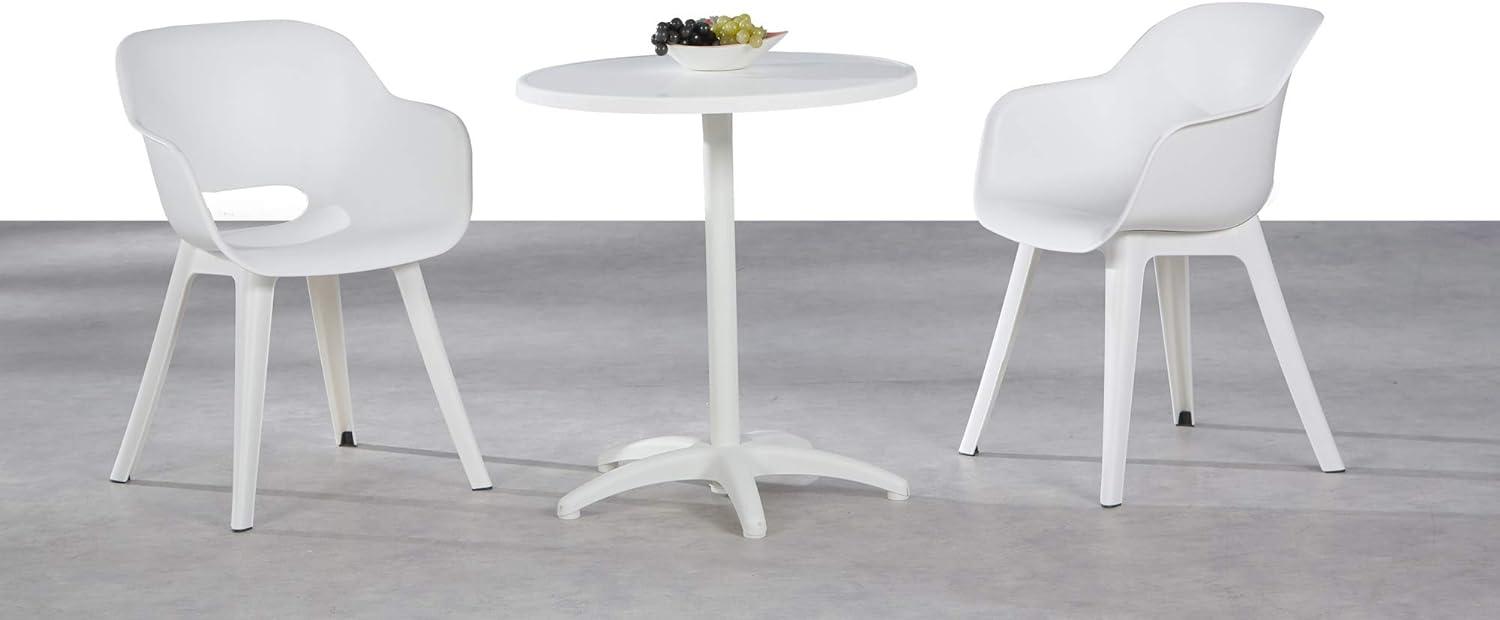 Das 3-tlg. Balkon-Set Split in Weiß besteht aus zwei Sesseln und einem Tisch, gefertigt aus hochwertigem Vollkunststoff im Retro-Look. Die Sessel bieten optimalen Sitzkomfort durch ihre perfekt geformte Sitzschale und stabile Gestell-Konstruktion. Das Material aus 100 % Polypropylen macht die Möbel absolut witterungsbeständig. Der Tisch verfügt über eine wetterfeste Tischplatte mit umlaufendem Kantenschutz. **Highlights** - Hochwertiger Vollkunststoff im Retro-Look - Stabile Gestell-Konstruktion für optimalen Sitzkomfort - Absolut witterungsbeständig dank 100 % Polypropylen - Platzsparend verpackt und leicht montierbar - Wetterfeste Tischplatte mit umlaufendem Kantenschutz **Produkteigenschaften** - Material: 100 % Polypropylen - Maße Sessel: Gesamtmaß BxTxH in cm: 57 x 56 x 80, Sitzfläche BxT in cm: 40 x 42, Sitzhöhe: 45 cm, Höhe der Armlehne: 66 cm, Höhe der Rückenlehne: 37 cm - Maße Tisch: rund 70 cm Ø, Tischhöhe: 72 cm **Lieferumfang** - 2x Sessel - 1x Tisch