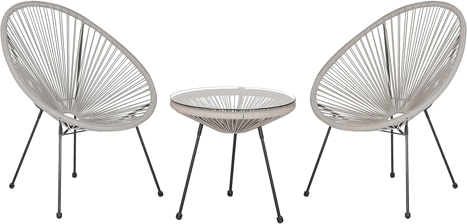 Das Bistro Set ACAPULCO II in Hellgrau kombiniert modernes Design mit Funktionalität. Die Spaghetti-Sessel und der Beistelltisch aus pflegeleichtem PE Rattan sind ideal für Innen- und Außenbereiche. Die rutschfeste Tischplatte aus Sicherheitsglas sorgt für Stabilität. Mit einer maximalen Belastung von 160 kg pro Stuhl und 50 kg für den Tisch ist dieses Set perfekt für gesellige Runden. **Highlights** - Rutschfeste Tischplatte mit Saugnäpfen für sicheren Halt - Niedrige und tiefe Sitzfläche für hohen Komfort - Geeignet für Innen- und Außenbereiche - Schutzkappen zum Schutz des Bodens - Robuste Tischplatte aus Sicherheitsglas **Produkteigenschaften** - Typ: Bistro Set - Stil: Modern - Farbe: Hellgrau - Material: PE Rattan - Zusätzliches Material: Stahl - Tischplattenmaterial: Glas - Finish: Pulverbeschichtet - Abmessungen Stuhl: 70 x 90 x 87 cm - Abmessungen Couchtisch: 50 x 50 x 49 cm - Sitzhöhe: 41 cm - Gewicht: 17 kg - Max. Belastung pro Stuhl: 160 kg - Max. Belastung des Tischs: 50 kg - Beständigkeit: Feuchtigkeitsbeständig, Schmutzbeständig, UV-beständig **Lieferumfang** - 1 x Tisch - 2 x Stühle