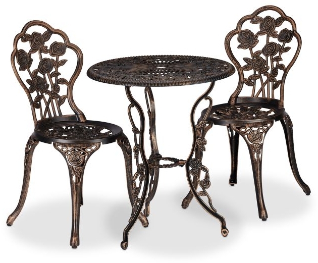 Das 3-teilige Gartenmöbel Set 10036110_1254 entführt Sie in die französische Provence mit seinem romantischen Design. Der runde Terrassentisch und die 2 Stühle im antiken Vintage-Stil mit floralem Muster passen perfekt auf jeden Balkon oder in den Garten. Aus beschichtetem Aluminiumguss gefertigt, sind sie leicht und dennoch robust. **Highlights** - Romantisches Design im Vintage-Stil: Versetzt Sie in die französische Provence. - Kompakte Größe: Ideal für kleine Balkone, aber auch für größere Gärten geeignet. - Robustes Material: Aus beschichtetem Aluminiumguss für Langlebigkeit. - Verstellbare Stuhlbeine: Ausgleich von Unebenheiten für stabilen Stand. - Dekoratives Rosenmuster: Für eine gemütliche Atmosphäre im Freien. **Produkteigenschaften** - Maße Tisch H x D: ca. 69x60 cm / Gewicht: ca. 4,1 kg - Traglast Tisch: ca. 80 kg - Maße Stühle H x B x T: ca. 83 x 43 x 52 cm / Gewicht: ca. 3,1 kg - Traglast je Stuhl: ca. 100 kg - Sitzhöhe: ca. 41 cm, Sitzfläche D: ca. 37 cm - Rückenlehne H x B: ca. 42x40 cm - Material: Aluminiumguss **Lieferumfang** - 1x Balkontisch in Einzelteilen - 2x Balkonstuhl in Einzelteilen - Anleitung und Montagematerial enthalten - Dekoartikel nicht im Lieferumfang enthalten