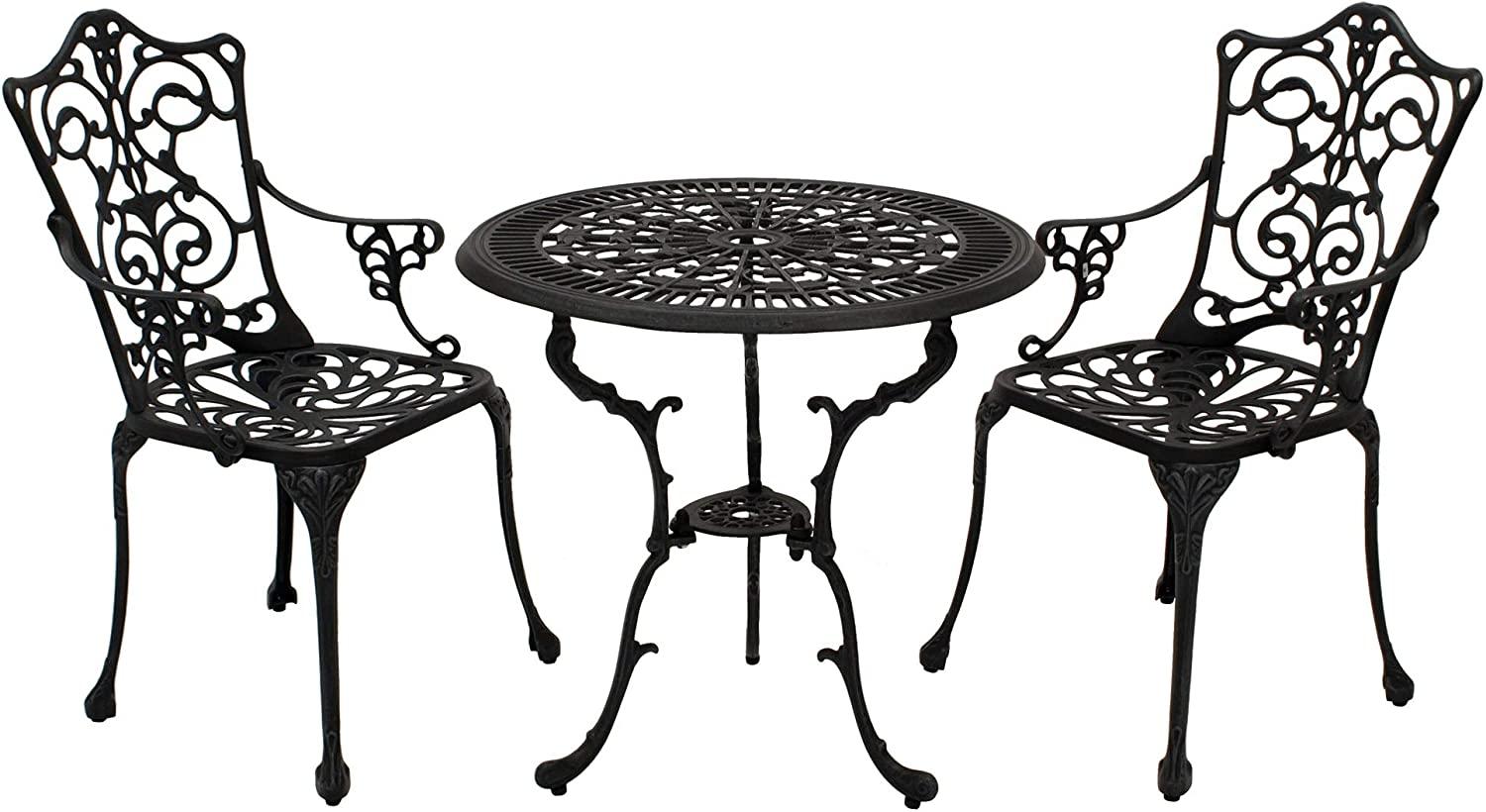Das Bistroset im Jugendstil besteht aus 3 Teilen und ist aus wetterfestem Aluguss in grau antik gefertigt. Es bietet nicht nur bequeme Sitzgelegenheiten, sondern ist auch ein elegantes Dekoelement für Ihren Garten. Das Set ist rostfrei, leicht und stabil, ideal für den Außenbereich. **Highlights** - Wetterfestes Aluguss-Material für Langlebigkeit - Rostfrei und ideal für den Außenbereich - Elegantes Design als Schmuckstück für jeden Garten - Leicht und einfach zu transportieren - Solide und stabile Verarbeitung **Produkteigenschaften** - Maße Tisch: Durchmesser 70 cm, Höhe 70 cm - Maße Sessel: Breite 58 cm, Tiefe 53 cm, Höhe 90 cm, Rückenhöhe 50 cm, Sitzhöhe 43 cm, Sitzbreite 42 cm, Sitztiefe 41 cm - Farbton: grau antik - Füße mit Stellschrauben zum Ausgleich von Bodenunebenheiten **Lieferumfang** - 2x Armlehnensessel - 1x Tisch 70 cm rund